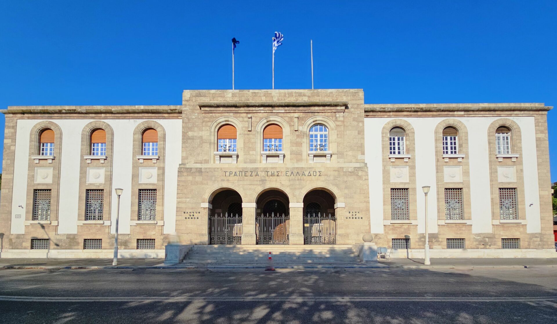 Η ανέγερση του εκλεκτικιστικού διώροφου κτηρίου της Τράπεζας της Ιταλίας (Banca d’Italia) ξεκίνησε το 1927, με σχέδια του αρχιτέκτονα Φλορεστάνο ντι Φάουστο, και ολοκληρώθηκε το 1930. Μετά την Ένωση των Δωδεκανήσων με την Ελλάδα το κτήριο περιήλθε στην ιδιοκτησία της Τράπεζας της Ελλάδας.