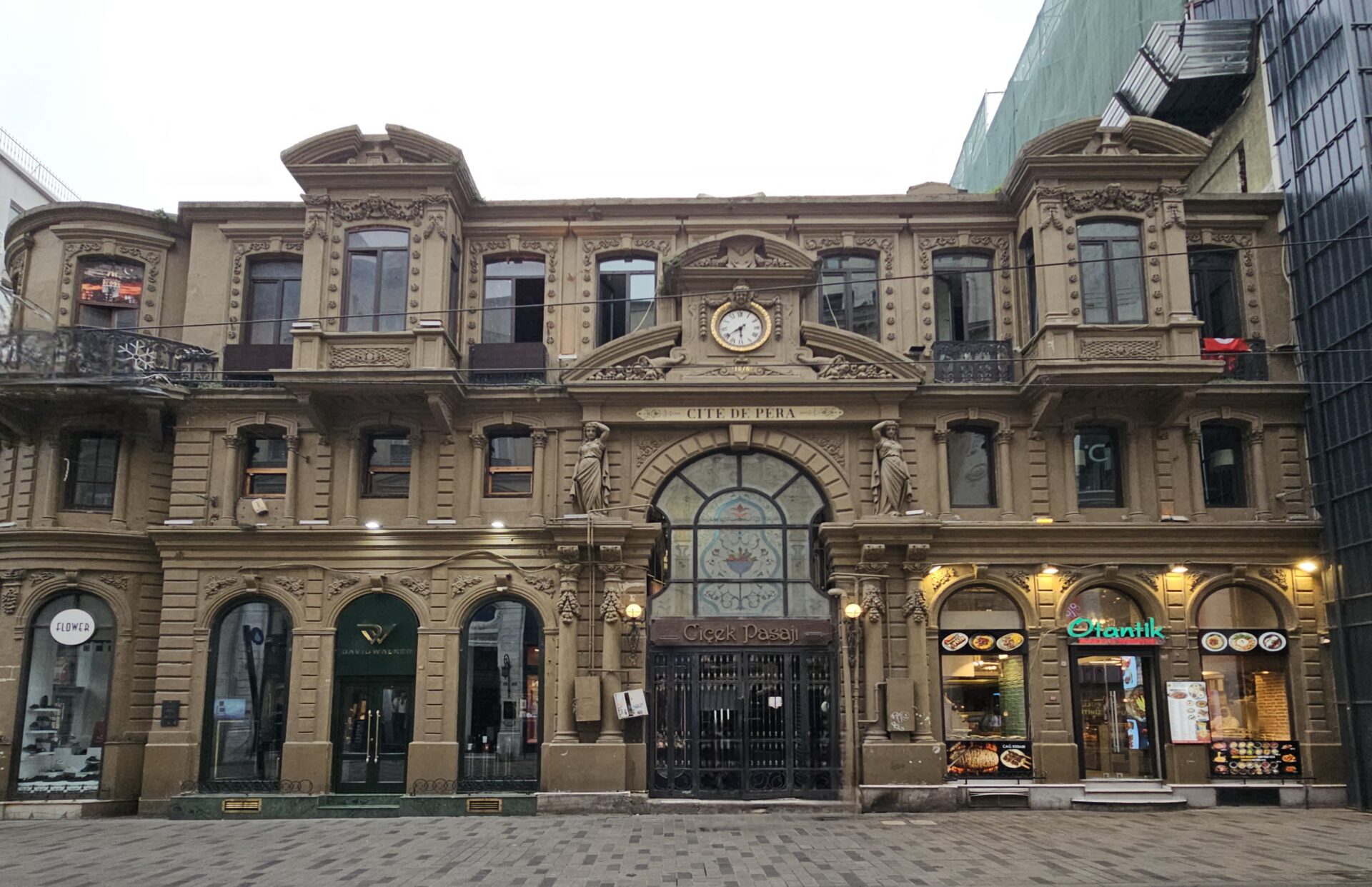 Η Στοά των Λουλουδιών (Çiçek Pasajı) είναι μία από τις πιο ιστορικές και εμβληματικές στοές στη Μεγάλη Οδό του Πέραν. Χτίστηκε στη θέση που κάποτε καταλάμβανε το Θέατρο Ναούμ, το οποίο υπέστη σοβαρές ζημιές από τη Μεγάλη πυρκαγιά του Πέραν το 1870. Μετά την πυρκαγιά, το θέατρο αγοράστηκε από τον Έλληνα τραπεζίτη Χριστάκη Ζωγράφο Εφέντη και, το 1876, ο αρχιτέκτονας Κλεάνθης Ζάννος σχεδίασε το σημερινό κτίριο. Στα πρώτα χρόνια, η στοά που στέγαζε τα καταστήματα ονομαζόταν Στοά Χρηστάκη (Hristaki Pasajı), ενώ τα διαμερίσματα ονομάζονταν Cité de Péra. Μετά τη Ρωσική Επανάσταση το 1917, πολλές νεόπτωχες Ρωσίδες από οικογένειες ευγενών που εγκατέλειπαν τη χώρα τους—συμπεριλαμβανομένης και μιας βαρόνης—άρχισαν να πωλούν λουλούδια στο κτίριο, δίνοντάς του το σημερινό όνομα. Σήμερα, η σκεπαστή στοά είναι πλέον ένα ζωντανό σημείο συνάντησης με πολλά εστιατόρια, καφετέριες και μπαρ.
