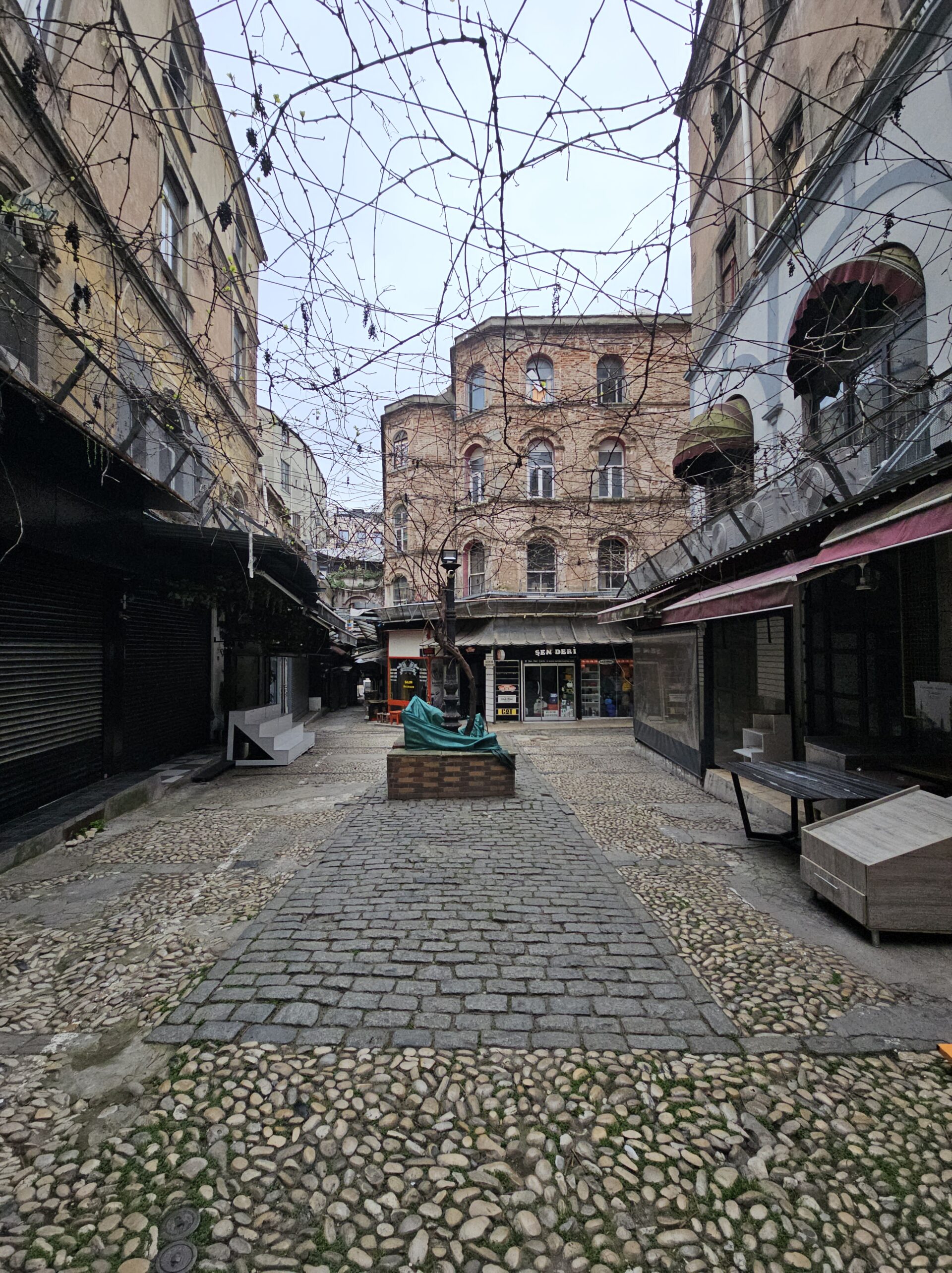 Το δάπεδο της στοάς είναι κατασκευασμένο από «Πέτρα από το Πόδημα», μια παραδοσιακή τεχνική με ένθετα βότσαλα που προέρχονται από τις ακτές του Γιαλίκιοϊ (παλιά ονομασία Πόδημα) στην περιοχή Τσατάλτζα στη Μαύρη Θάλασσα. Μέχρι τη δεκαετία του 1950, αυτά τα βότσαλα ήταν βασικό υλικό για κήπους και πλακοστρώσεις σε δρόμους και στοές της Κωνσταντινούπολης, προσδίδοντας έναν ιδιαίτερο, παραδοσιακό χαρακτήρα.