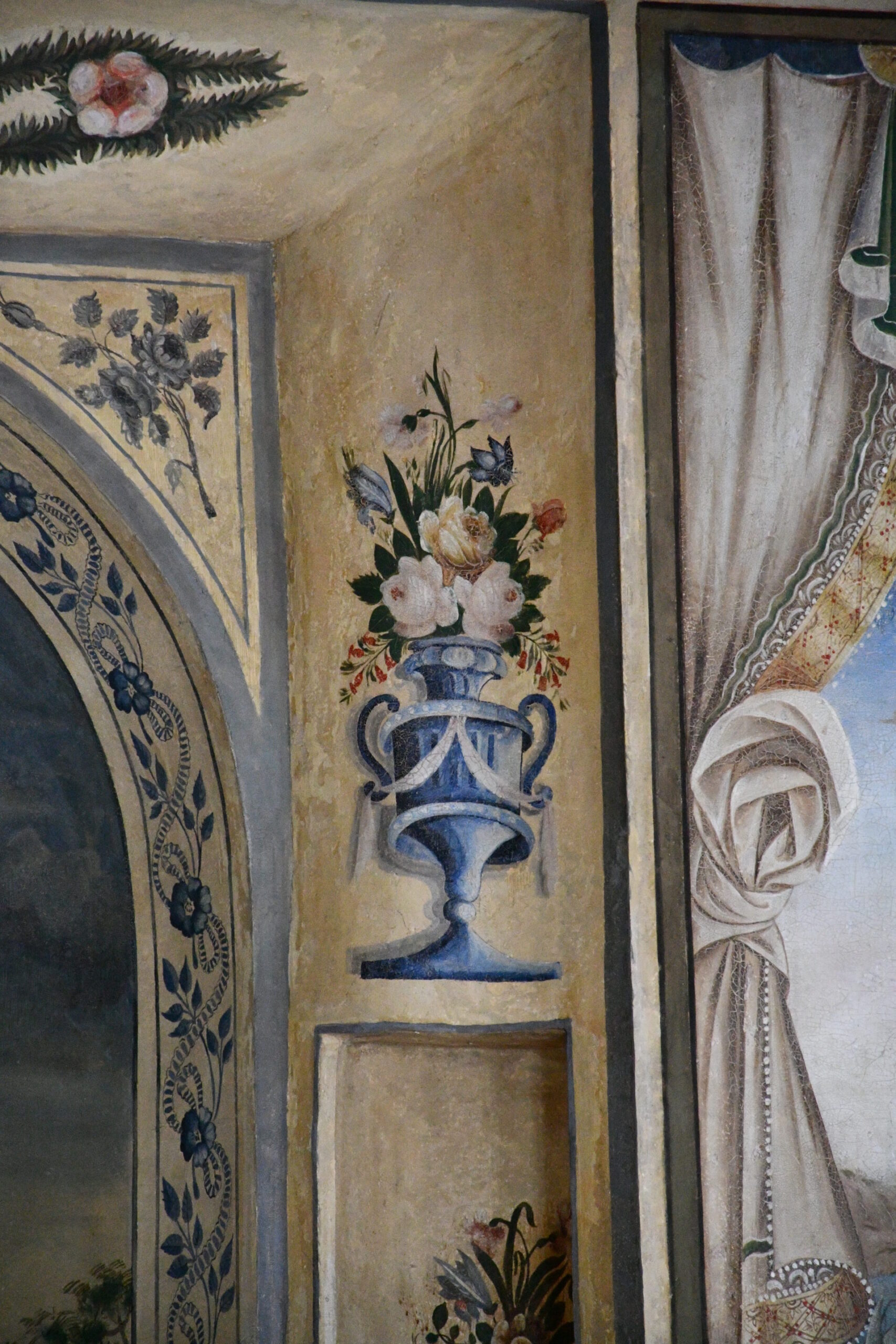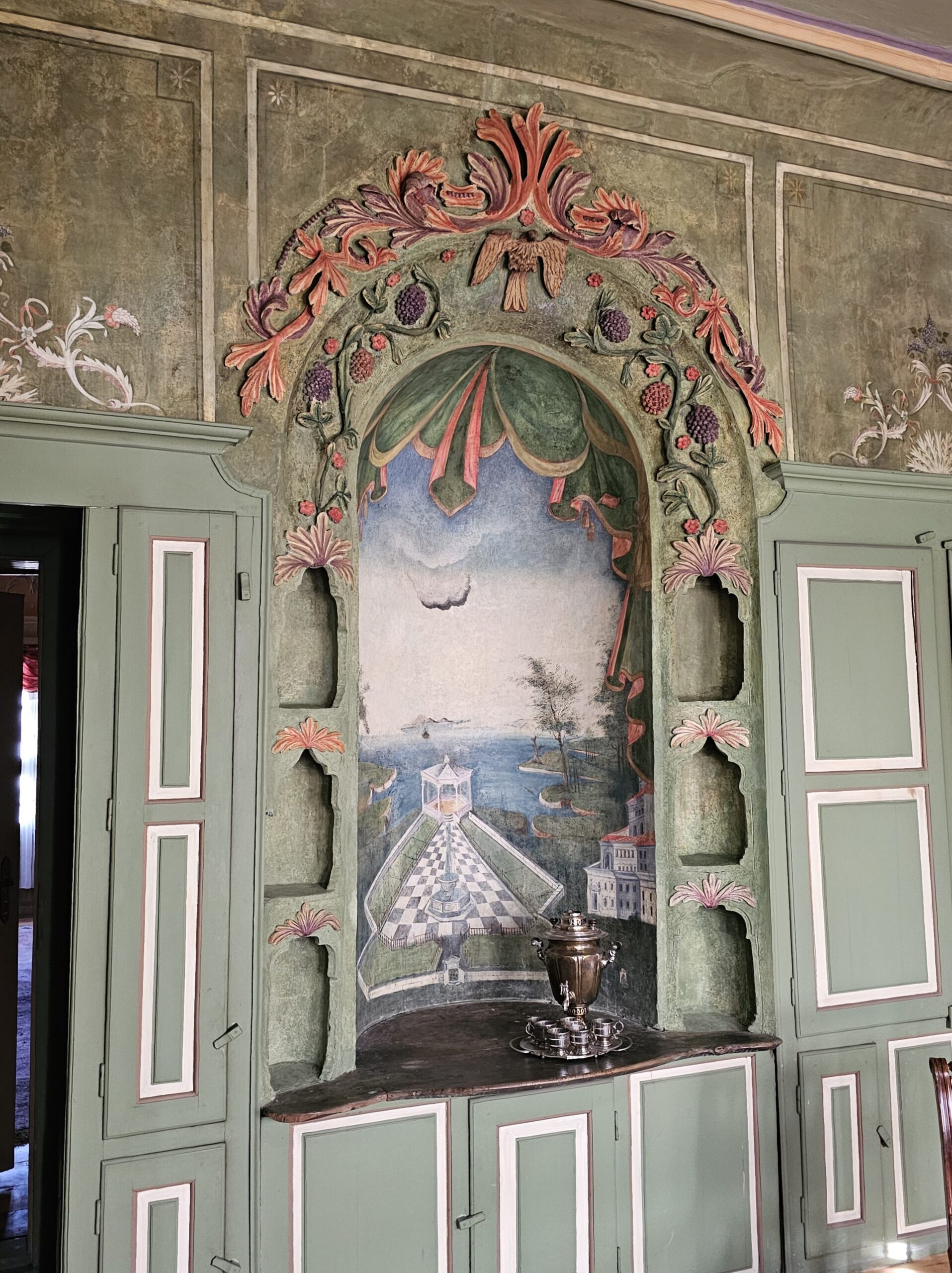 Οι ζωγραφισμένοι τοίχοι απεικονίζουν την Αγία Πετρούπολη, τη Στοκχόλμη, τη Λισαβόνα, την Αθήνα, τη Βενετία, την Αλεξάνδρεια και την Κωνσταντινούπολη, πόλεις όπου ο ιδιοκτήτης ταξίδευε για την επιχείρησή του.