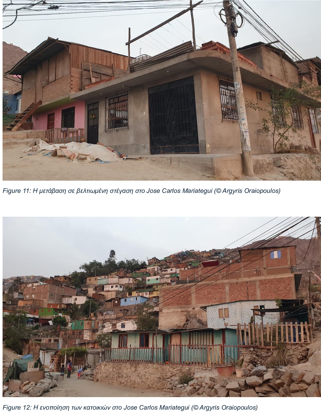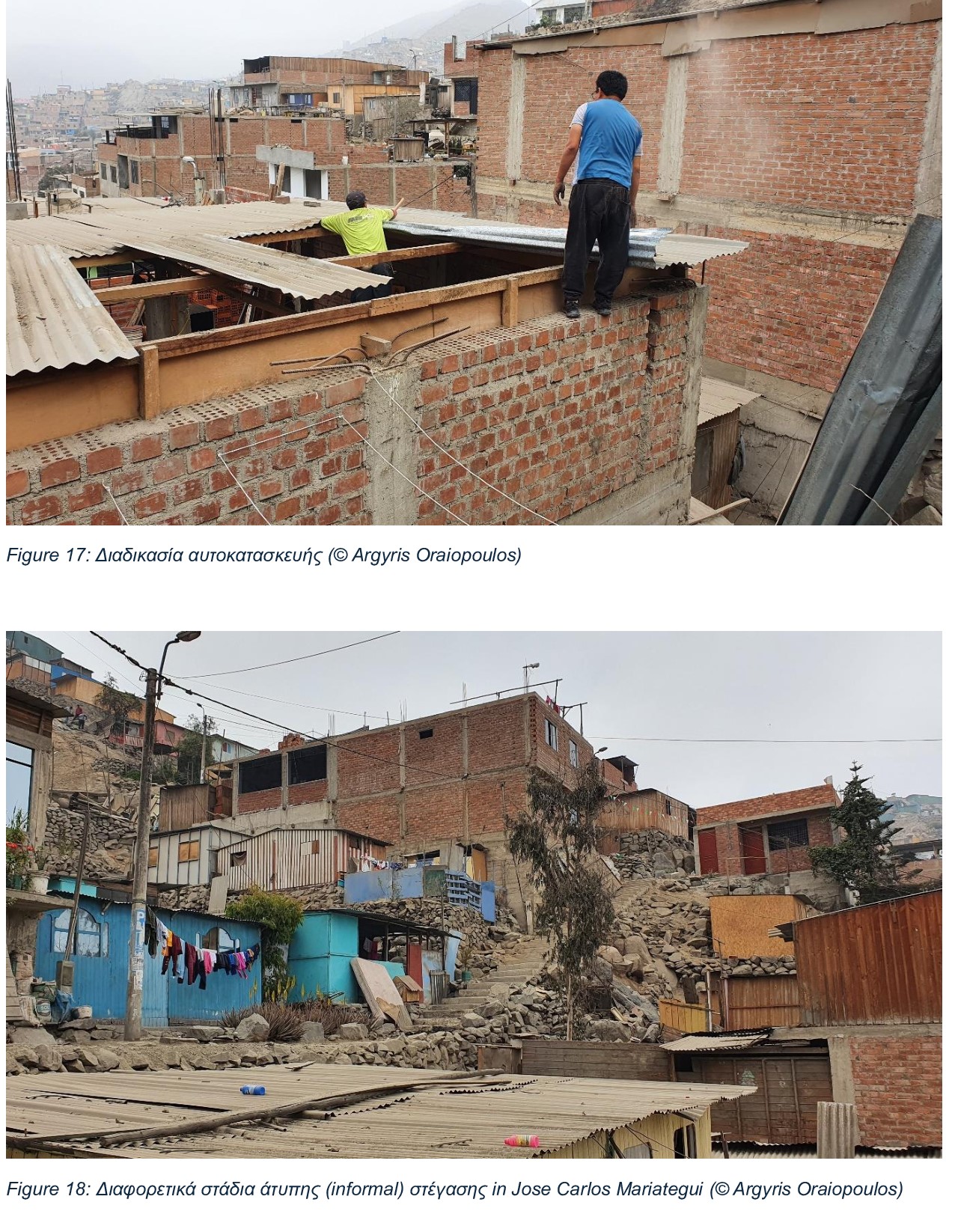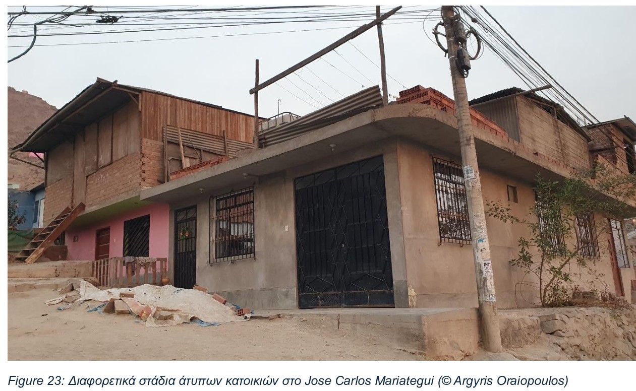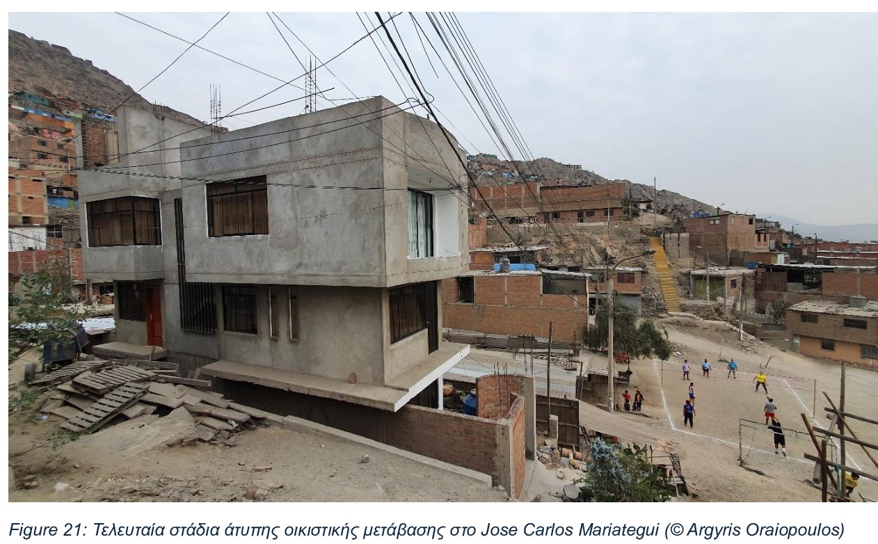 Τα σπίτια μετατρέπονται σιγά σιγά από τις αρχικές επικίνδυνες μονόροφες κατασκευές από λεπτούς ξύλινους τοίχους και ελαφριές, συχνά μεταλικές, υποτυπώδεις στέγες, σε ολοένα και πιο ενοποιημένα πολυώροφα κτίρια, από μπετόν, που στεγάζουν οικογένειες διαφορετικων γενεών. Ανάλογα με το εισόδημα του νοικοκυριού, αυτή η διαδικασία μπορεί να διαρκέσει 10, 20, 30 ακόμη και 40 χρόνια για να υλοποιηθεί, παγιώνοντας εμπειρίες και πραγματικότητες που περιβάλλονται από πολλαπλούς κινδύνους για την υγεία, ειδικά για τις πιο ευάλωτες ομάδες των κοινοτήτων, τους νέους και τους ηλικιωμένους.