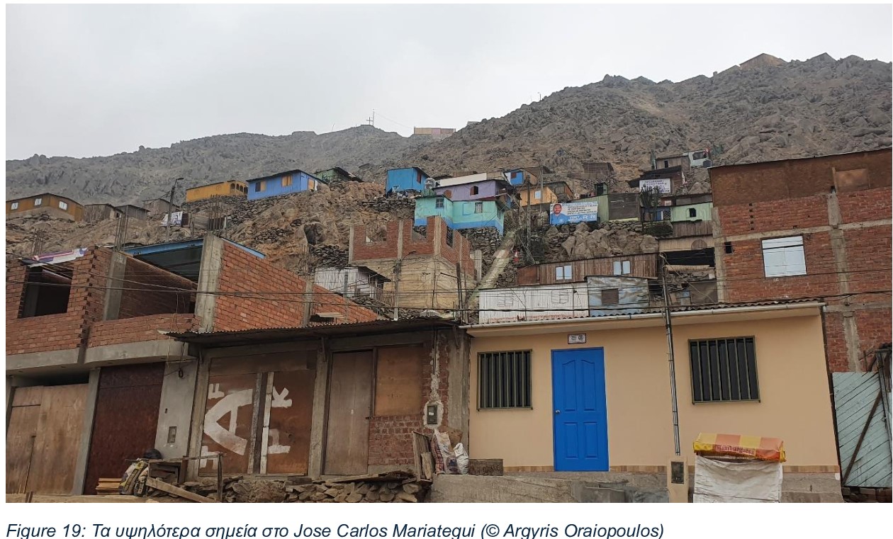 To Jose Carlos Mariategui, στους απότομους λόφους των Άνδεων προς τα βόρεια όρια της πόλης, είναι μια νεοσύστατη γειτονιά που γίνεται γρήγορα ένα ενοποιημένο μέρος της Λίμα. Σε υψόμετρα 500-700 μέτρων πάνω από την επιφάνεια της θάλασσας, η συνεχής πάλη των κατοίκων τόσο με το έντονο κρύο όσο και με τη ζέστη σε εσωτερικούς χώρους τους χειμερινούς και καλοκαιρινούς μήνες αντίστοιχα, είναι μια δύσκολη πραγματικότητα.