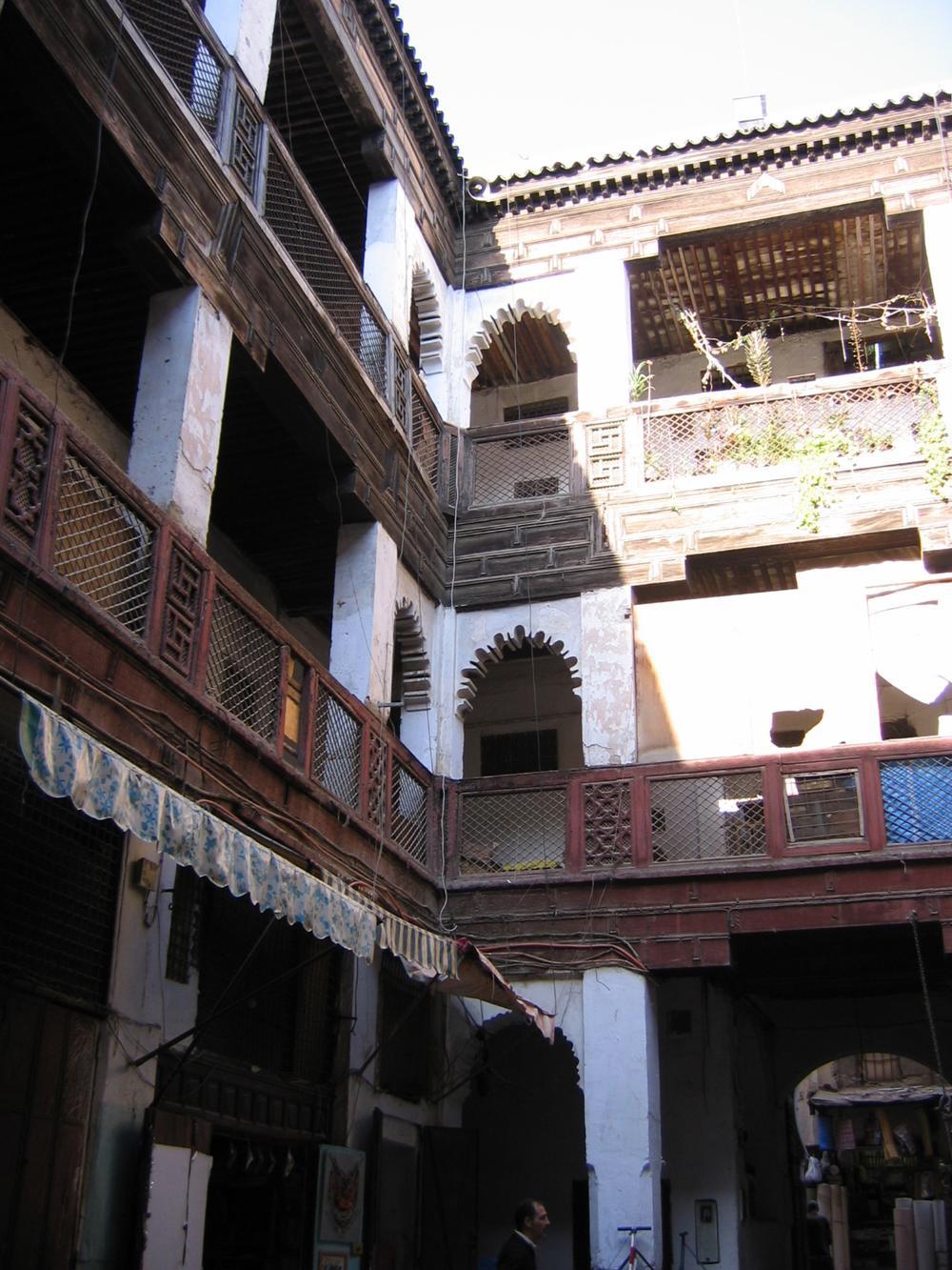 Μέσα στο εσωτερικό αίθριο, με φυτά και σιντριβάνια, βλέπουν όλα τα μπαλκόνια και τα ανοίγματα του κτιρίου, μιας και δεν υπάρχουν καθόλου ανοίγματα στο δρόμο.