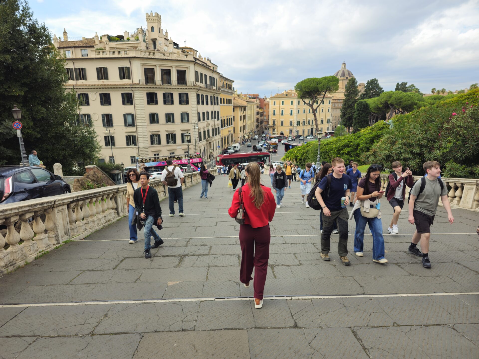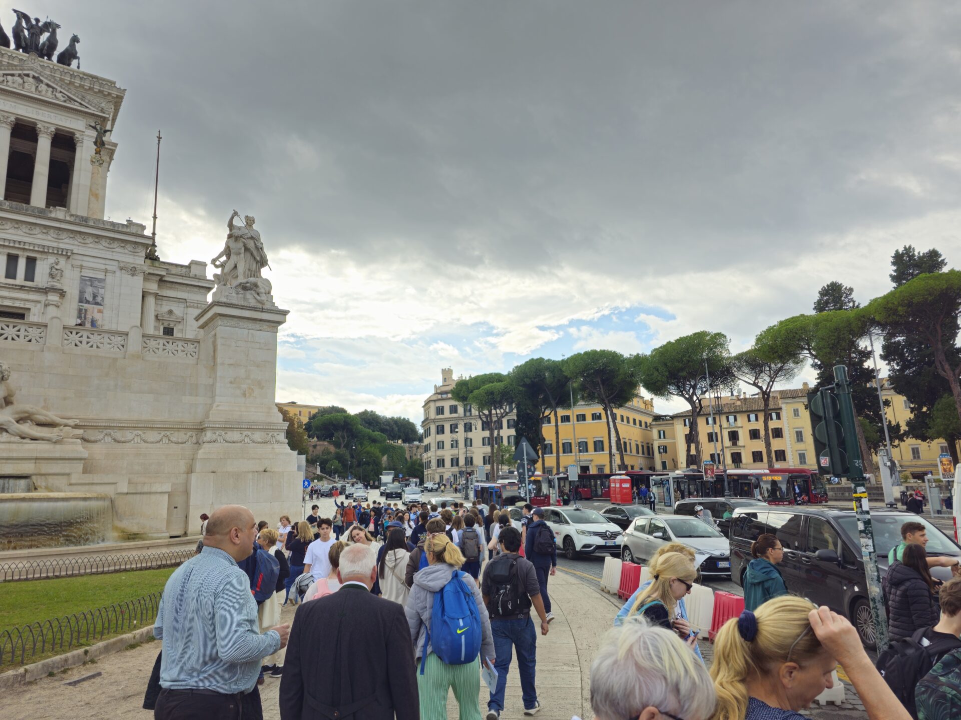 Κατεβαίνοντας τα σκαλιά του Καπιτωλίνου λόφου, η πόλη ξανοίγεται ξανά μπροστά σου, δυνατή και γεμάτη κίνηση, τουριστικά λεωφορεία, φωνές, μηχανάκια, γκρουπ από τουρίστες
