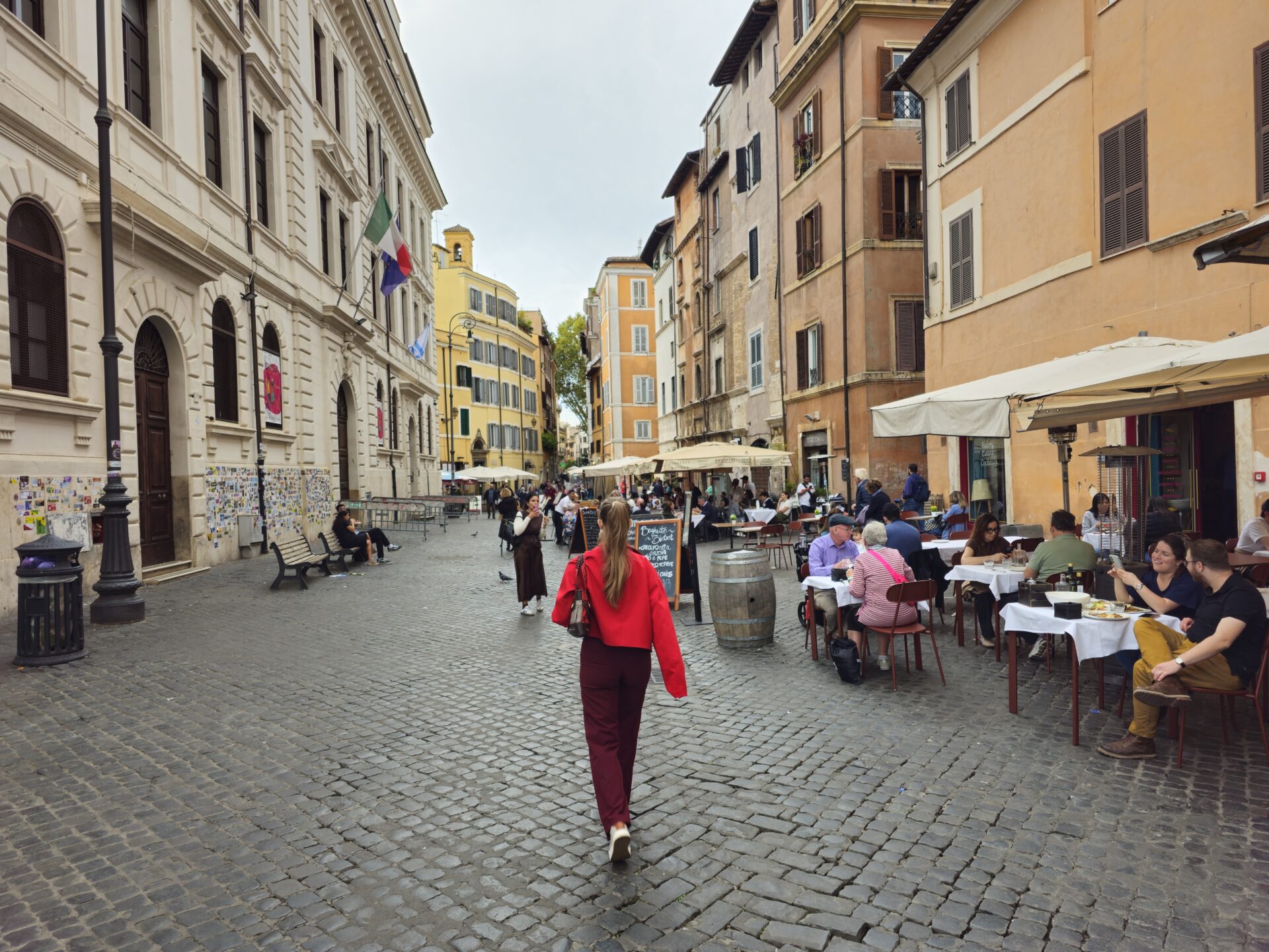 Είχαμε πιάσει μεσημέρι και ο κόσμος άρχισε να μαζεύεται στα τραπεζάκια των εστιατορίων για το Pranzo. Oι Ρωμαίοι λατρεύουν να τρώνε έξω στους πλακόστρωτους δρόμους, all’aperto όπως το λένε.