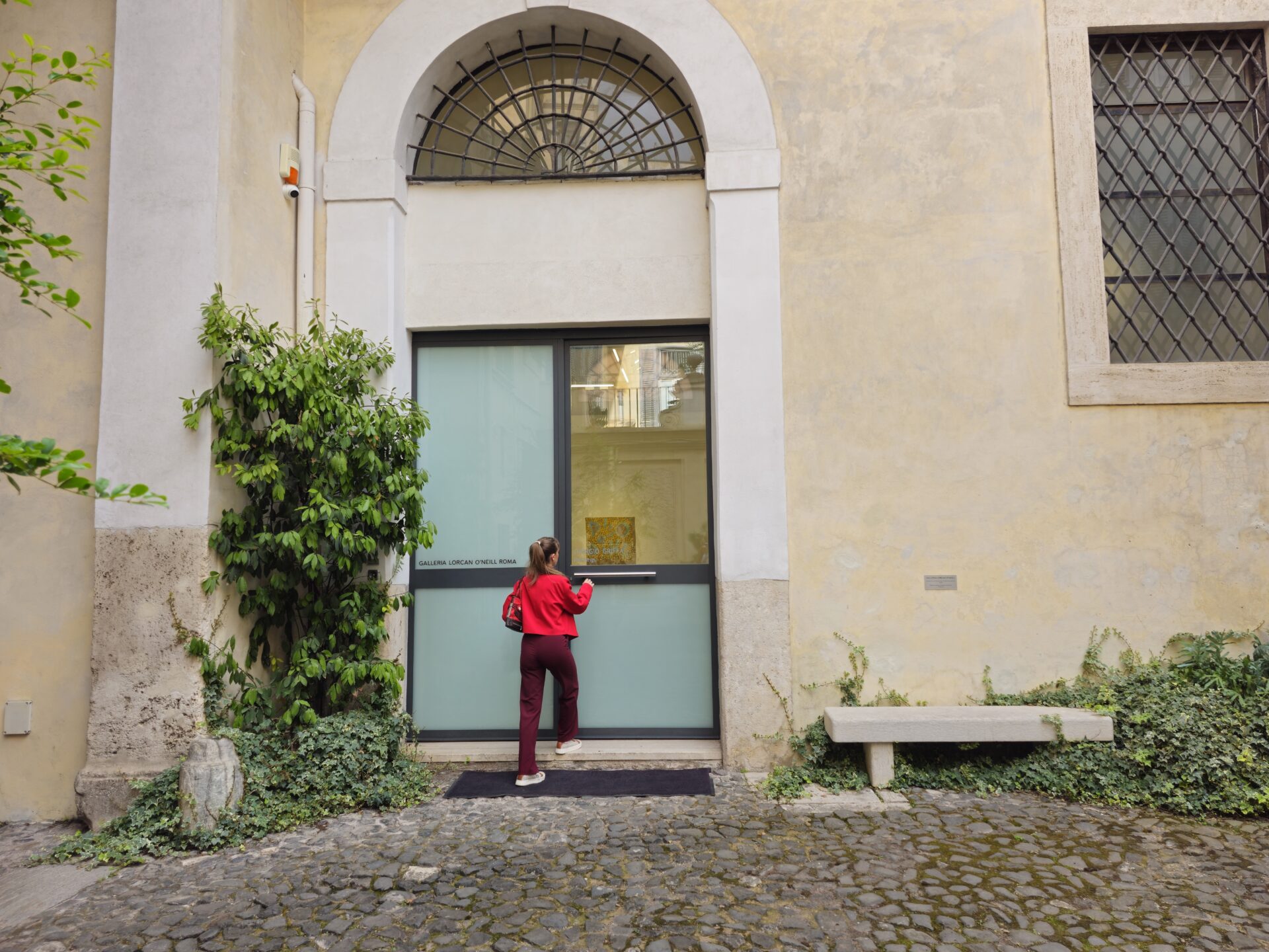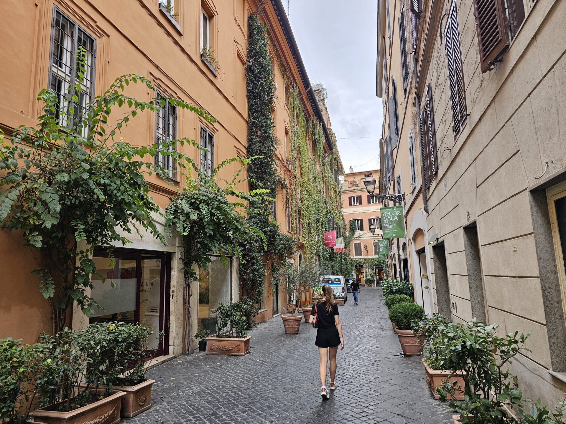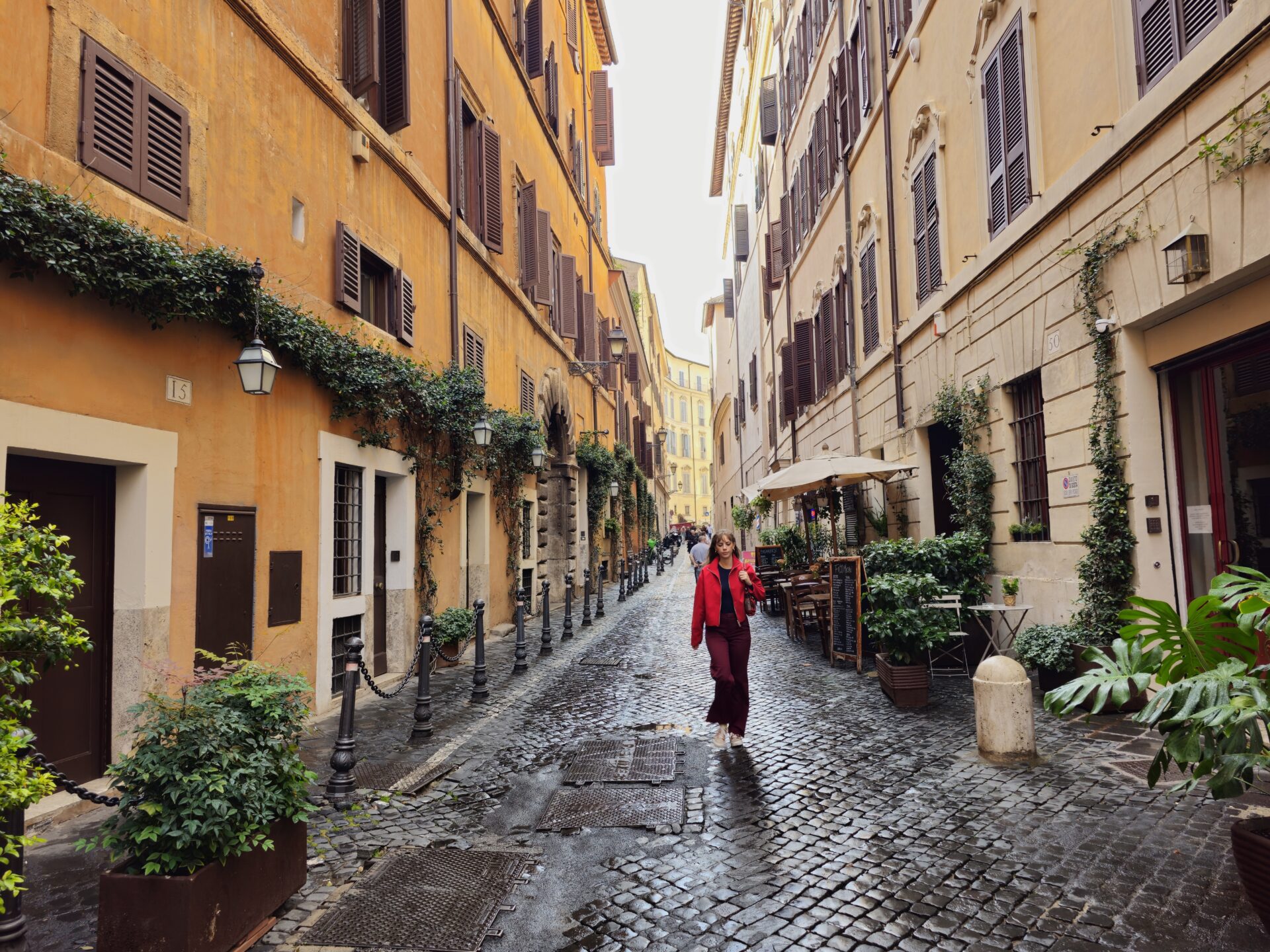 Είχαμε αφήσει πίσω μας τα μνημεία της πόλης και περπατούσαμε στα λιθόστρωτα δρομάκια της παλιάς Ρώμης τα γνωστά sampietrini. H Αρετή με τα κόκκινα έκανε μια ωραία αντίθεση με τα γήινα Ρωμαϊκά χρώματα.