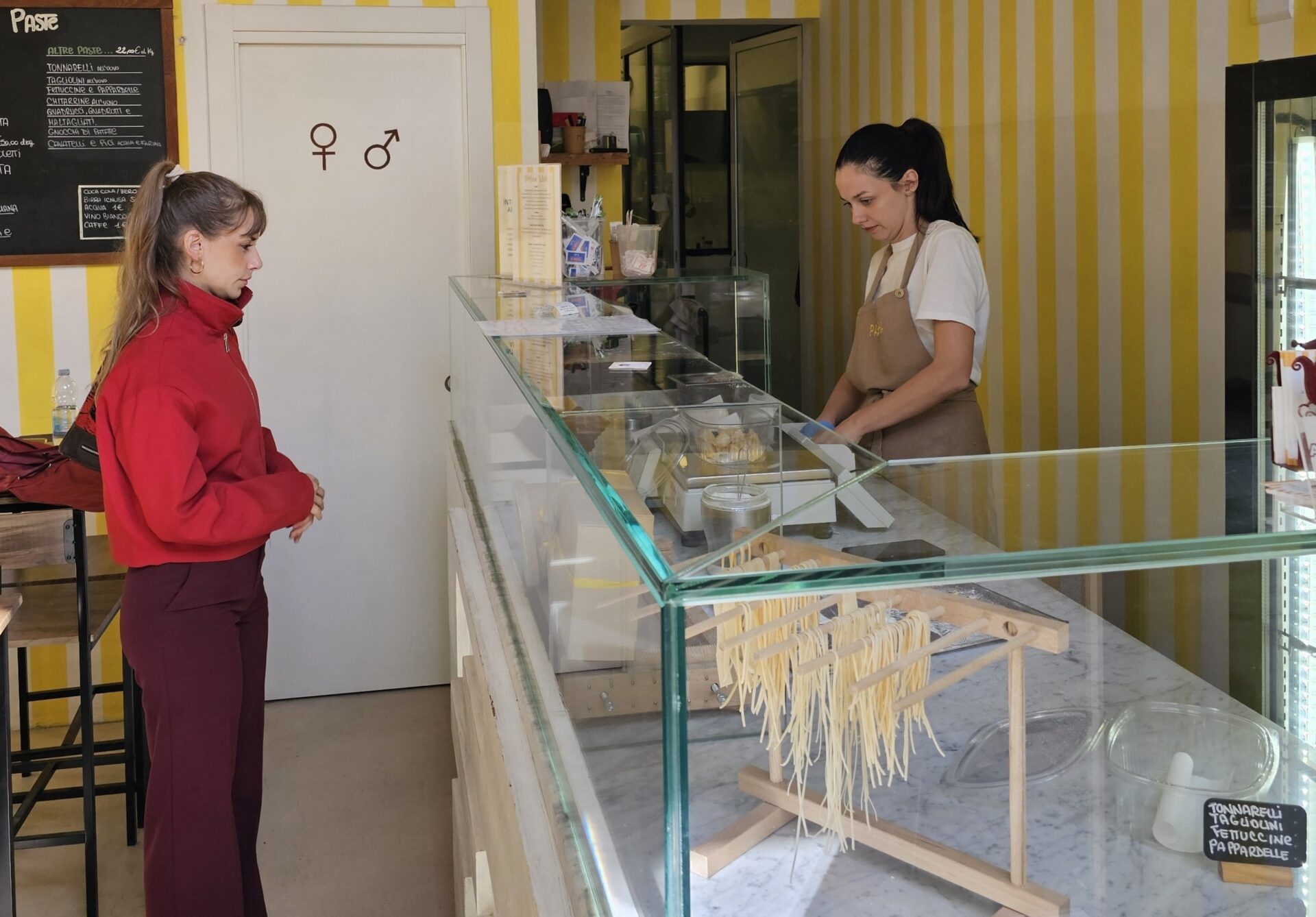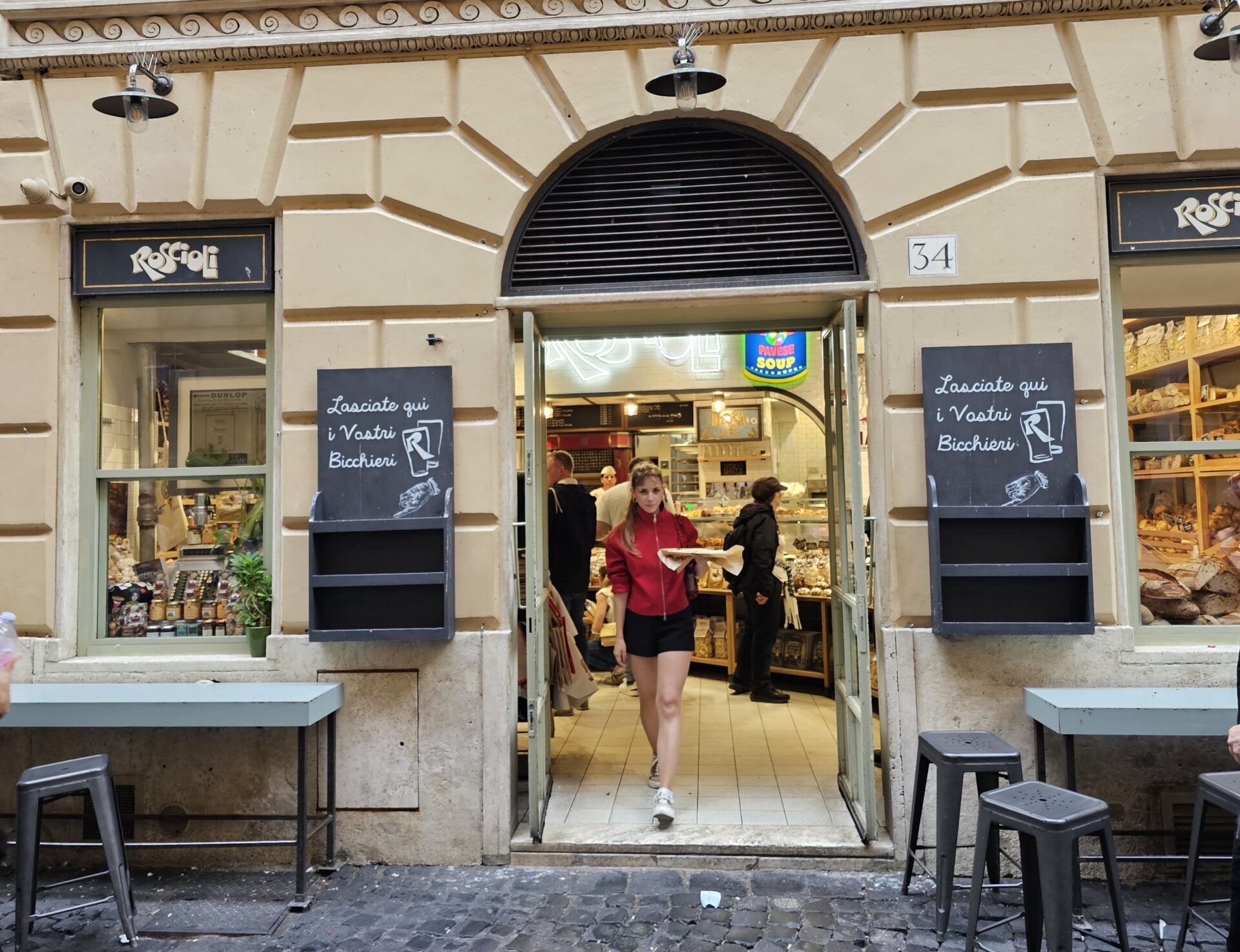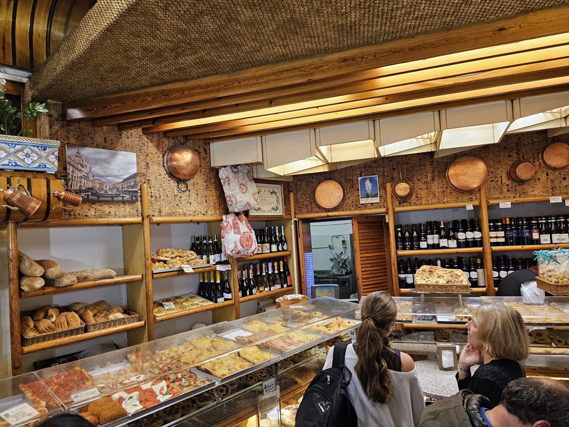 Στα ράφια είναι τα ψωμιά, πιο πέρα τα αλμυρά panini με mortadella, prosciutto, ή λιαστή ντομάτα και ρόκα. Έχει επίσης γλυκά, όπως Cornetti γεμιστά με κρέμα ή μαρμελάδα, maritozzi με σαντιγί, crostata με κονφί φρούτου και biscotti. Για τουριστικούς λόγους έβαλε και κάποια κρασιά.