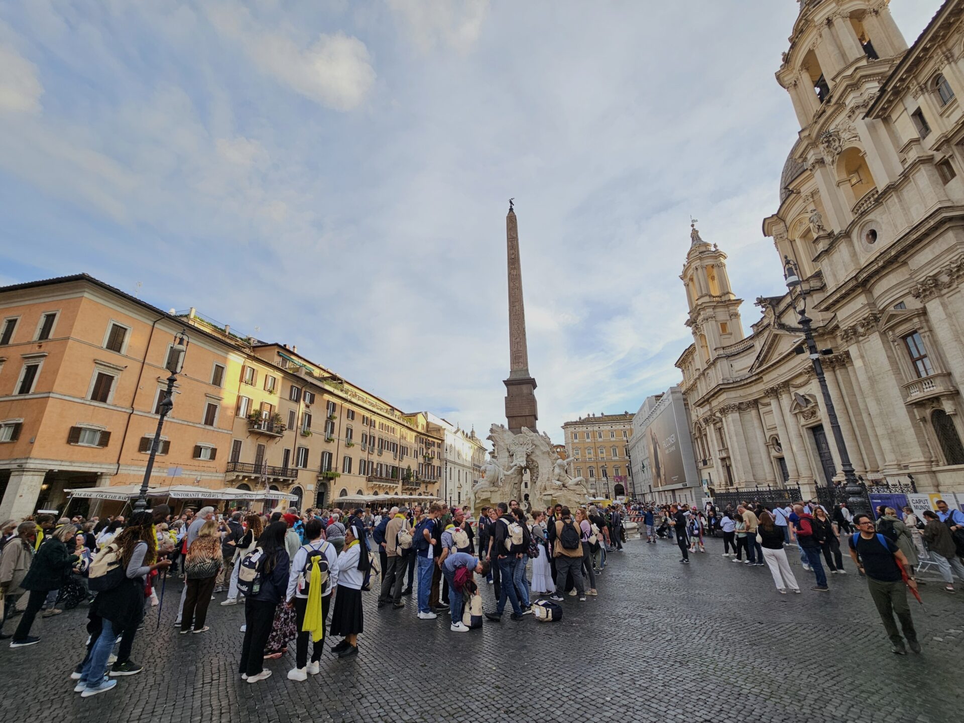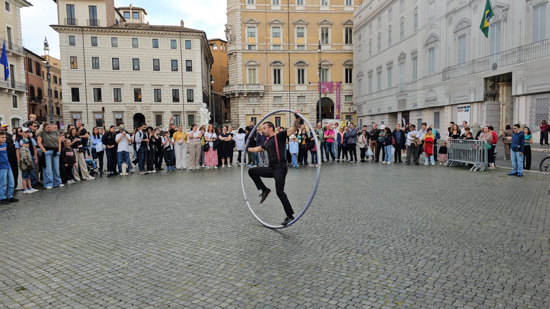 Στην Piazza Navona συναντήσαμε έναν εκπληκτικό ακροβάτη με τη μεταλλική ρόδα Cyr. Είχε μαζευτεί πολύς κόσμος για να τον παρακολουθήσει, ετοιμαζόταν και μας εξηγούσε την τεχνική του, όταν ήρθαν δύο αστυνομικοί και προσπάθησαν να τον διώξουν.