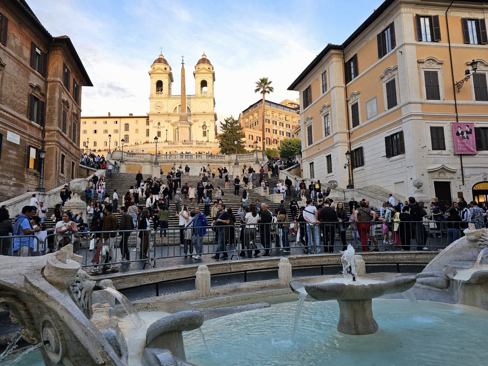Στο κέντρο της πλατείας θα δεις μια ιδιαίτερη μπαρόκ κρήνη σε σχήμα ημι-βουλιαγμένης βάρκας. Χρονολογείται από τις αρχές του 17ου αιώνα και έχει την υπογραφή του Pietro Bernini. Υπάρχει ένας μύθος που λέει πως ο σχεδιασμός της εμπνεύστηκε από μια πλημμύρα του Τίβερη που είχε μεταφέρει μια βάρκα ως εδώ, μια γοητευτική ιστορία που δίνει στην κρήνη τον χαρακτήρα ενός μικρού ρωμαϊκού θρύλου. Scalinata. Από την κρήνη ξεκινάει μια σκάλα με 135 μαρμάρινα σκαλιά που ανεβαίνουν έως την εκκλησία πάνω στο ύψωμα. Η σκάλα σχεδιάστηκε το 1723 από τον Francesco De Santis. Η σκάλα είναι εύκολη για να την ανεβείς και έχει δύο επίπεδα για να σταματήσεις και να δεις κάτω την πλατεία και την διάσημη σε πλούτο και αλαζονεία Via Condotti.