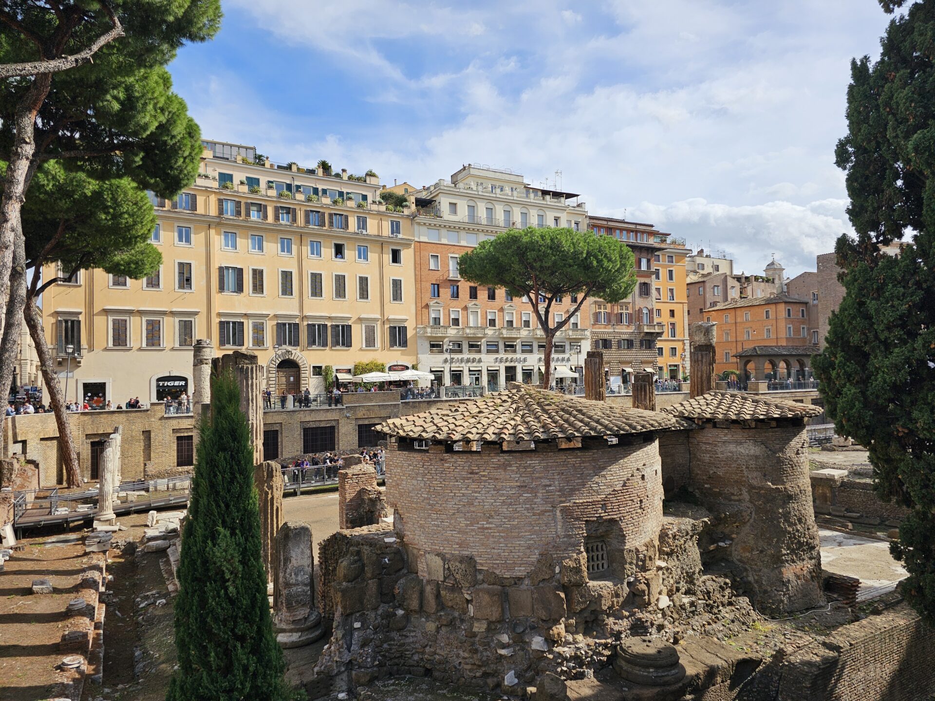 Το Largo di Torre Argentina είναι ένα σύμπλεγμα από τέσσερις ρωμαϊκούς ναούς που χρονολογούνται από τον 4ο έως τον 1ο αιώνα π.χ. Ο κυκλικός ναός που βλέπεις στη φωτογραφία είναι ο Ναός Β, αφιερωμένος πιθανότατα στη Fortuna Huiusce Diei. Οι ναοί σταδιακά εγκαταλείφθηκαν και στον Μεσαίωνα ο χώρος καλύφθηκε και χτίστηκαν από πάνω σπίτια. Το 1926–1929, κατά τη διάρκεια έργων, βρέθηκαν τα θεμέλια των ναών και ολόκληρη η περιοχή κατεδαφίστηκε για να αναδειχθεί ως αρχαιολογική ζώνη.