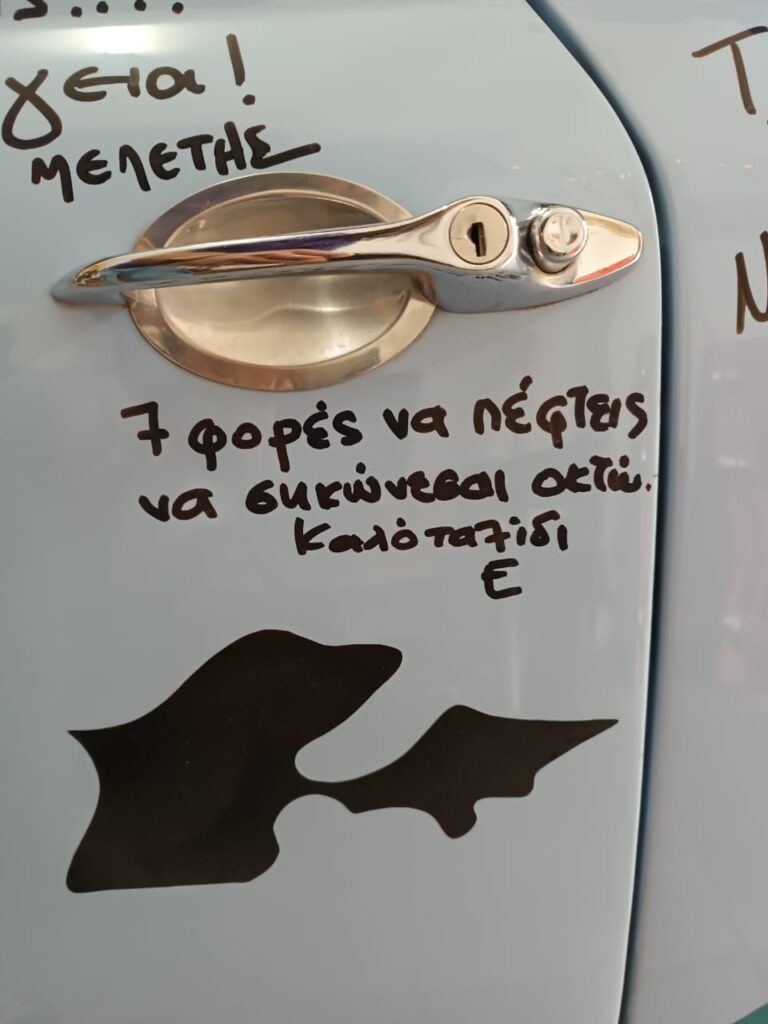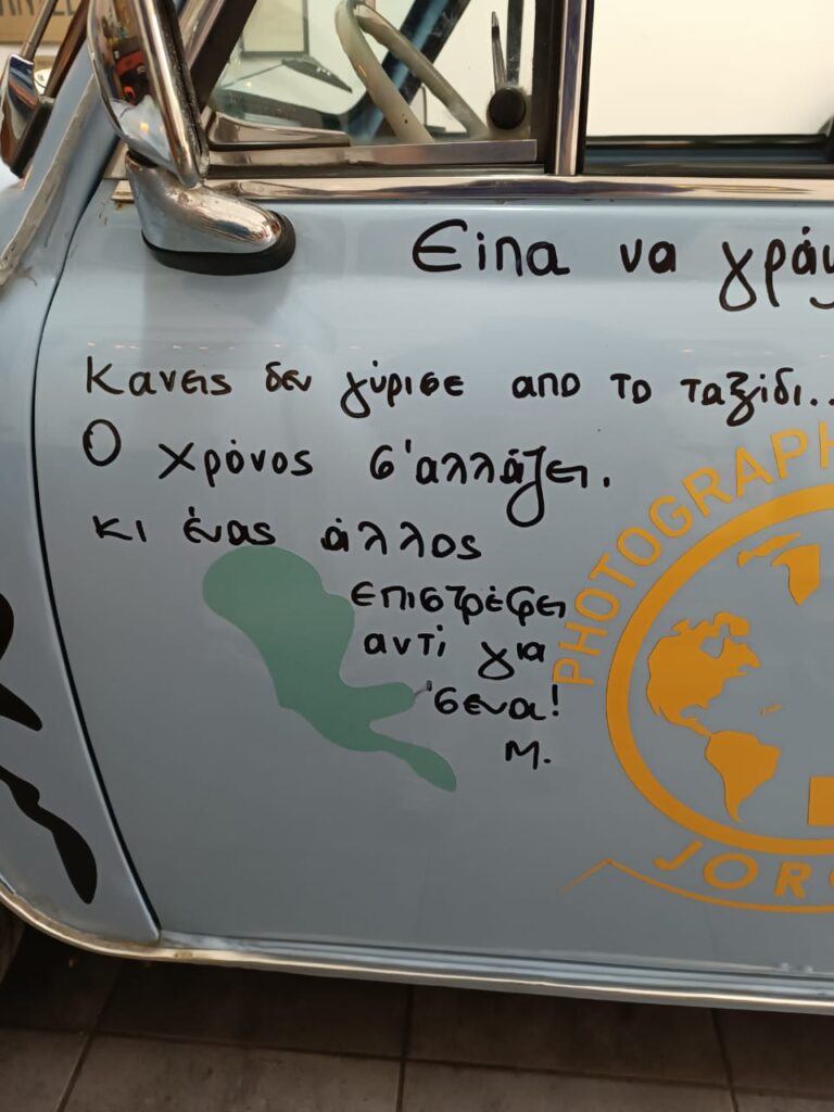 «Όλες οι ευχές που γράφτηκαν ήταν ιδιαίτερες, γιατί ήταν και από πολύ ιδιαίτερους ανθρώπους», θυμάται με συγκίνηση ο Γιώργος. «Από όλες, πιο πολύ εντύπωση μού έκαναν δύο στην πόρτα του οδηγού: “Εφτά φορές θα πέσεις, να σηκώνεσαι οκτώ” και “Κανείς δεν γύρισε από το ταξίδι. Ο χρόνος σ’ αλλάζει κι ένας άλλος επιστρέφει αντί για σένα”».