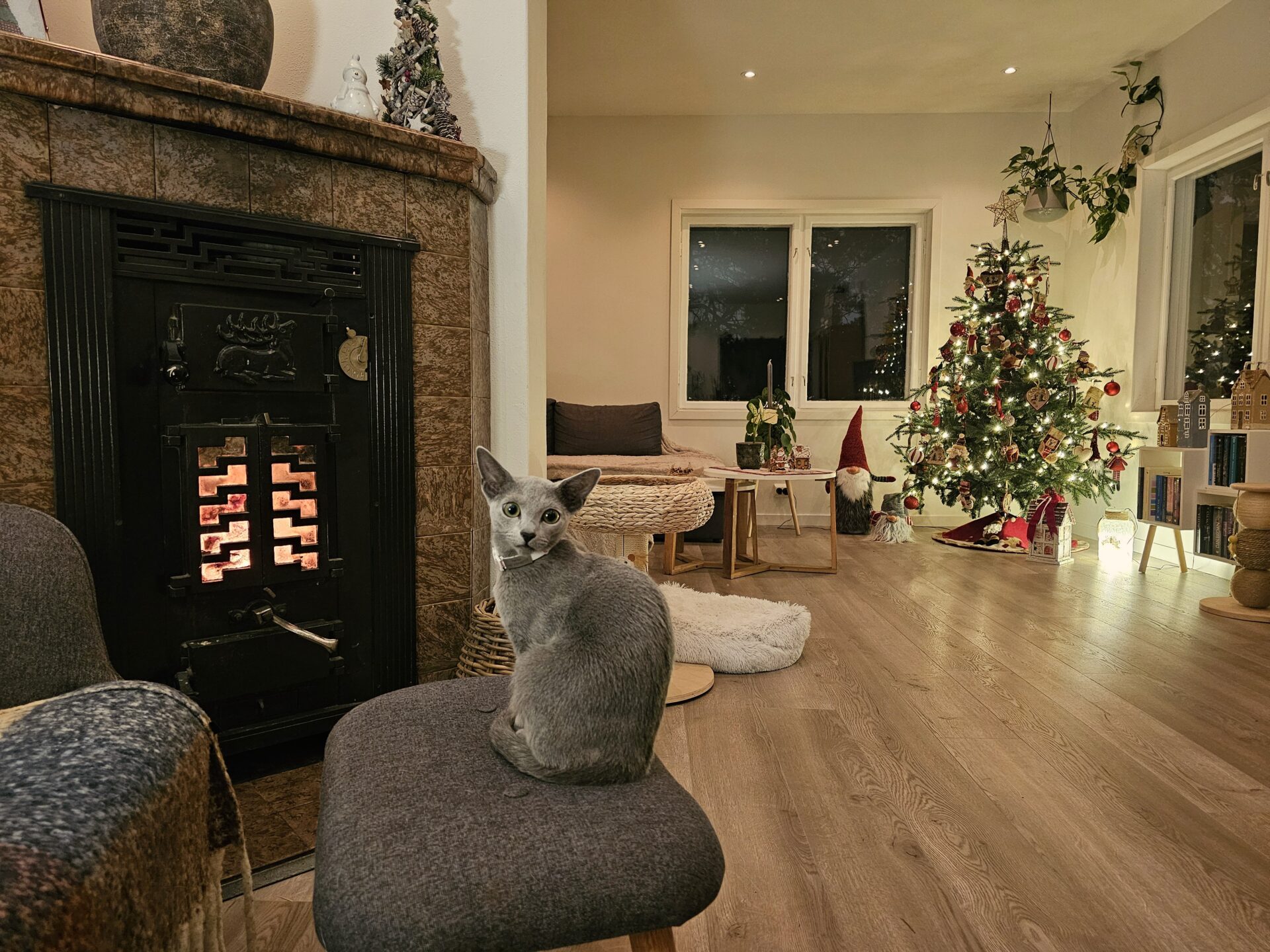 Οι γάτες είναι πολύ αγαπητές στους Νορβηγούς, σχεδόν κάθε σπίτι έχει μία γάτα. Σου δίνουν την δική τους ζεστασιά και αγάπη. Η όμορφη γατούλα στην φωτογραφία είναι η Πέρλα, μπλε Ρωσίας. Αυτές οι γάτες με το διάσημο “blue” γκρίζο-ασημί τους χρώμα, τα πράσινα μάτια και την αριστοκρατική ηρεμία σε γοητεύουν αμέσως. Εδώ δίπλα στο δάσος μπαινοβγαίνει ελεύθερα στο σπίτι και στον κήπο και απολαμβάνει ανέμελα την ζωή και την φύση.