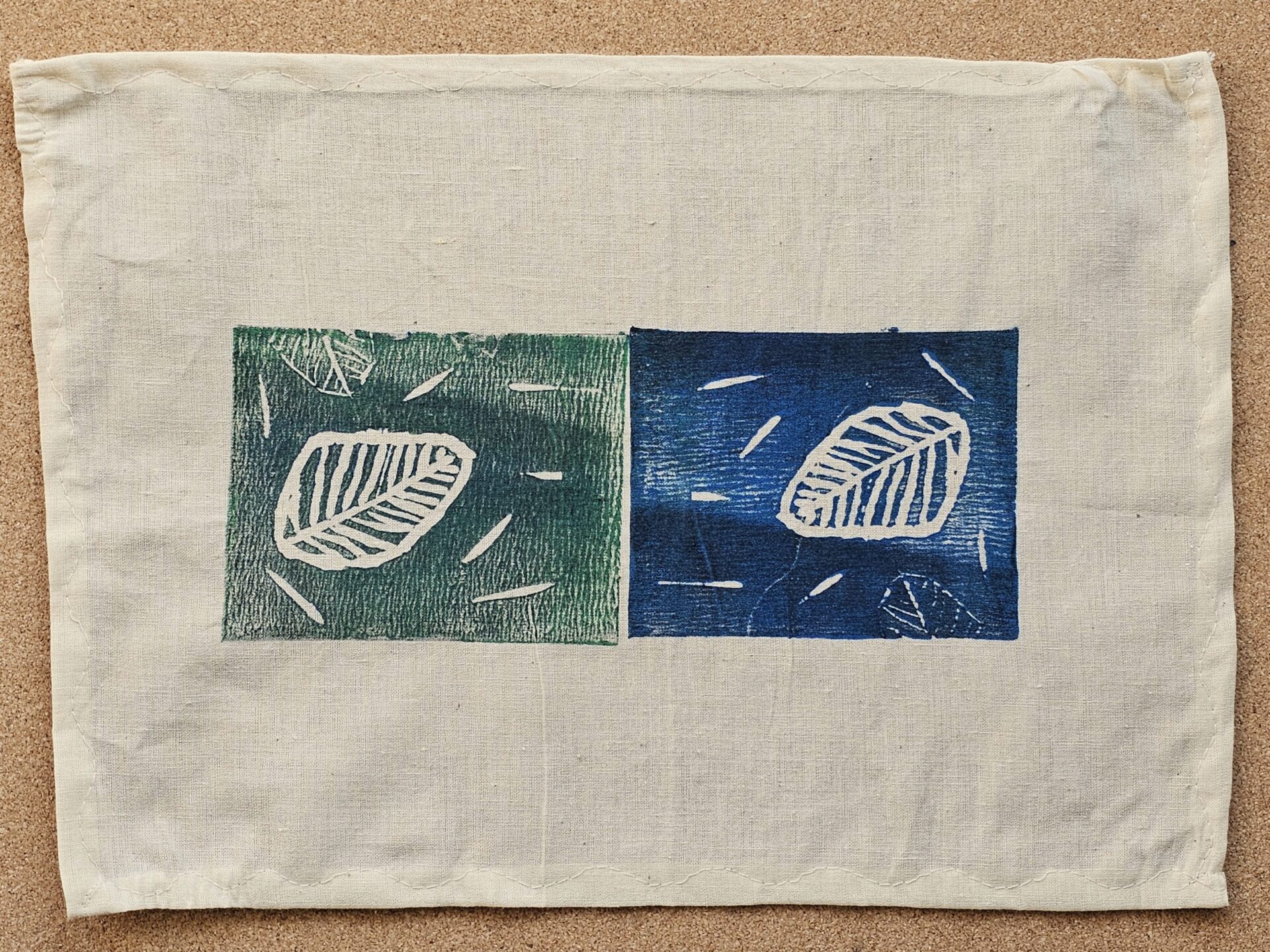 “The Leaf in Two Parts’’ έτσι ονόμασε αυτό το έργο του ο Panos που είναι εμπνευσμένο από το φθινόπωρο και τα φύλλα του δάσους. Είναι ένα διπλό linoprint τυπωμένο πάνω σε ακατέργαστο ύφασμα. Προσπάθησα να το αναλύσω όσο μπορούσα μιας και δεν μοιάζει με παιδική ζωγραφιά.