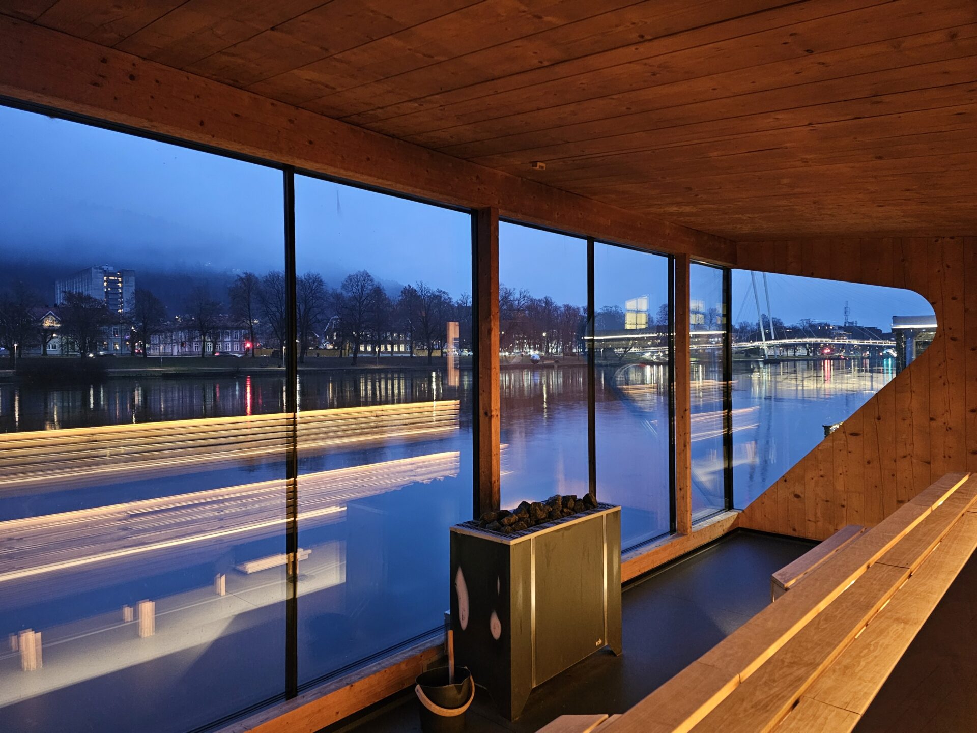 Περπάτησες στο φρέσκο χιόνι, πάγωσες και τώρα ήρθε η στιγμή να ζεσταθείς και να χαλαρώσεις. Αυτό θα το κάνει και με το παραπάνω η σάουνα. Αυτή η πλωτή σάουνα μέσα στο ποτάμι δίπλα στο φιόρδ ήταν μοναδική εμπειρία. Το μεγάλο τζάμι μπροστά, σου έδινε άπλετη θέα στο ποτάμι και στο περιβάλλον.