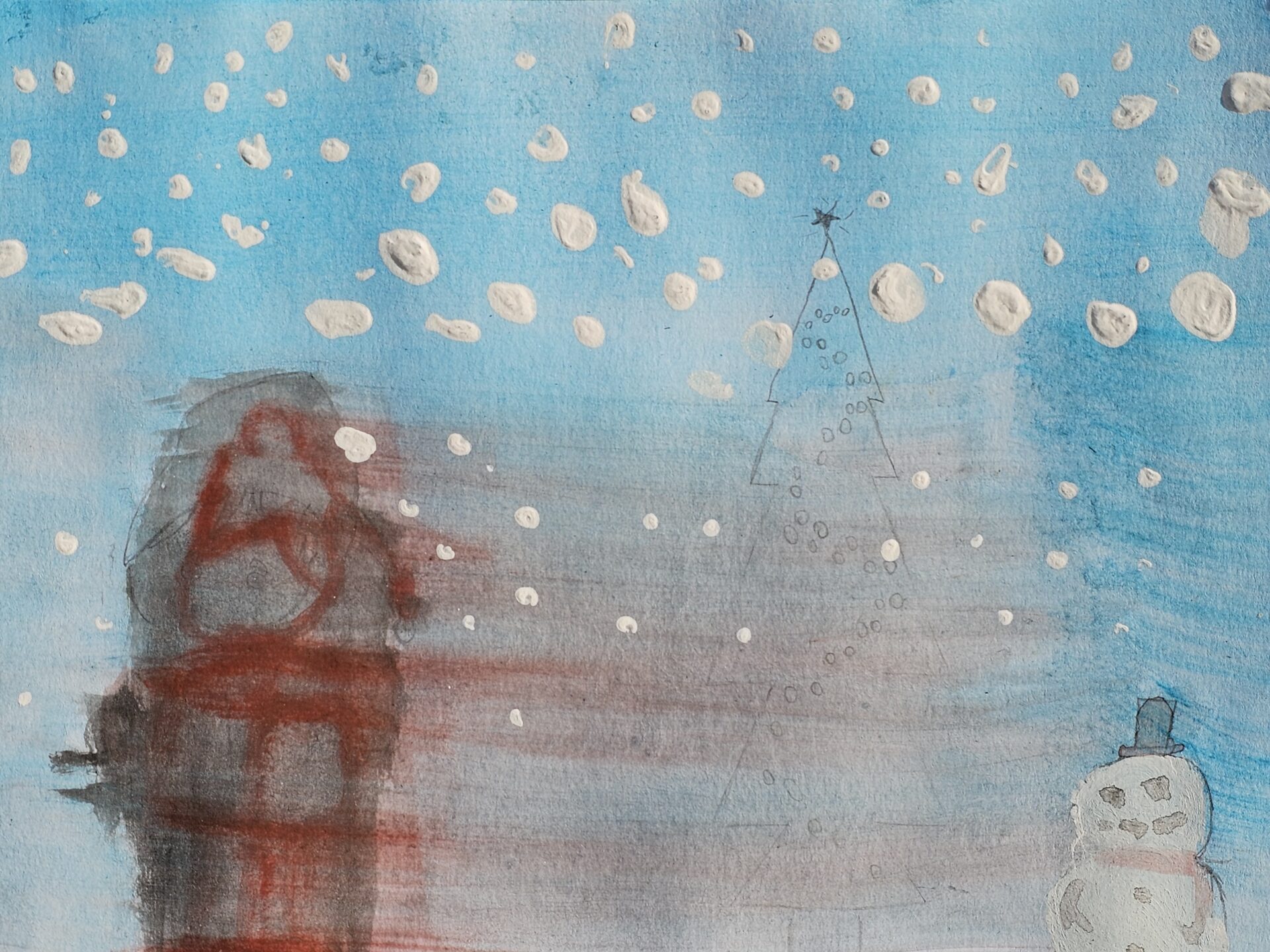 Αγαπημένο θέμα στις παιδικές Χριστουγεννιάτικες ζωγραφιές ο χιονάνθρωπος, το δέντρο, οι νιφάδες από το χιόνι και ο Άγιος Βασίλης που τρέχει να προλάβει, όπως σε αυτή την ζωγραφιά του Panos.