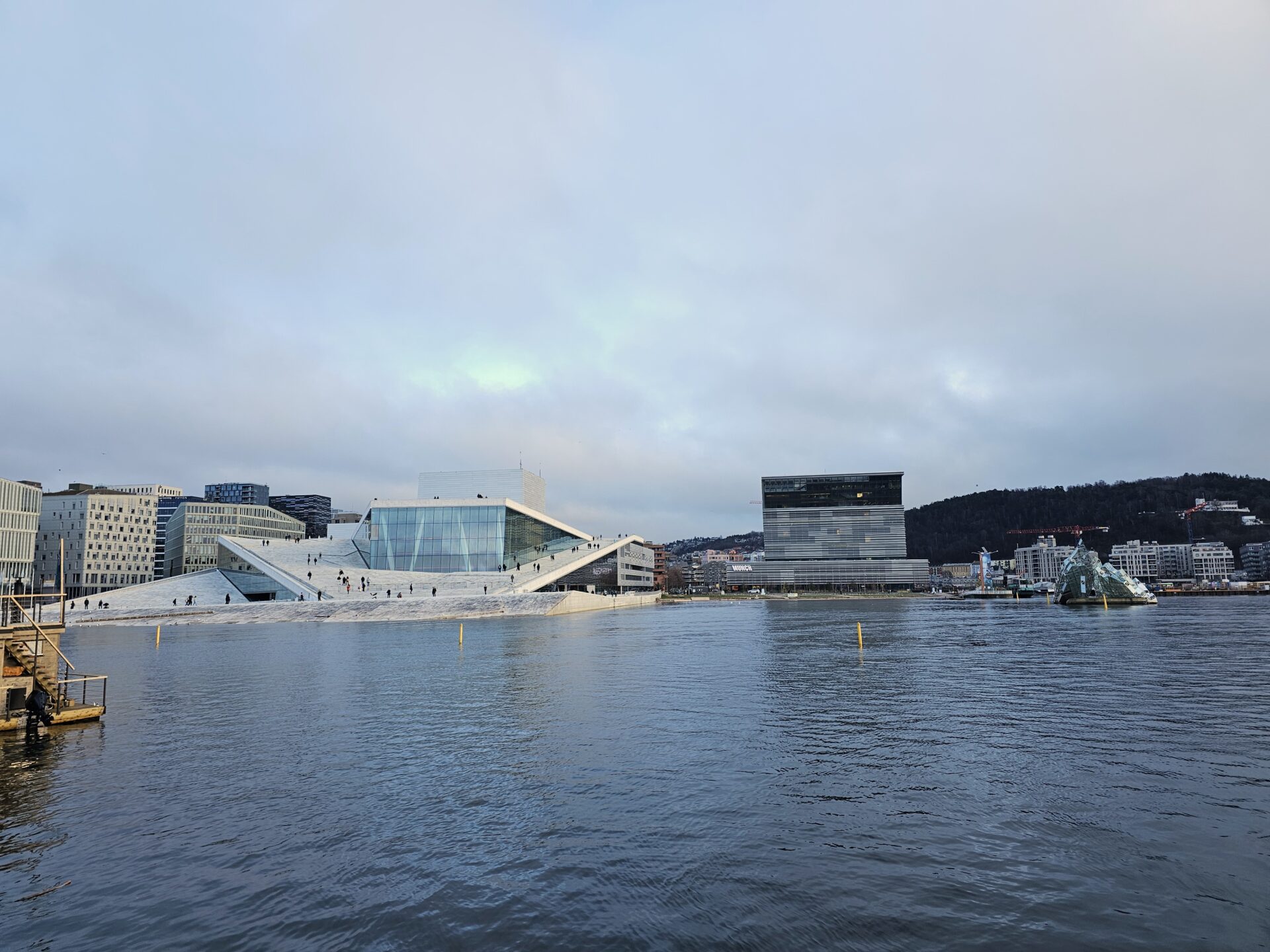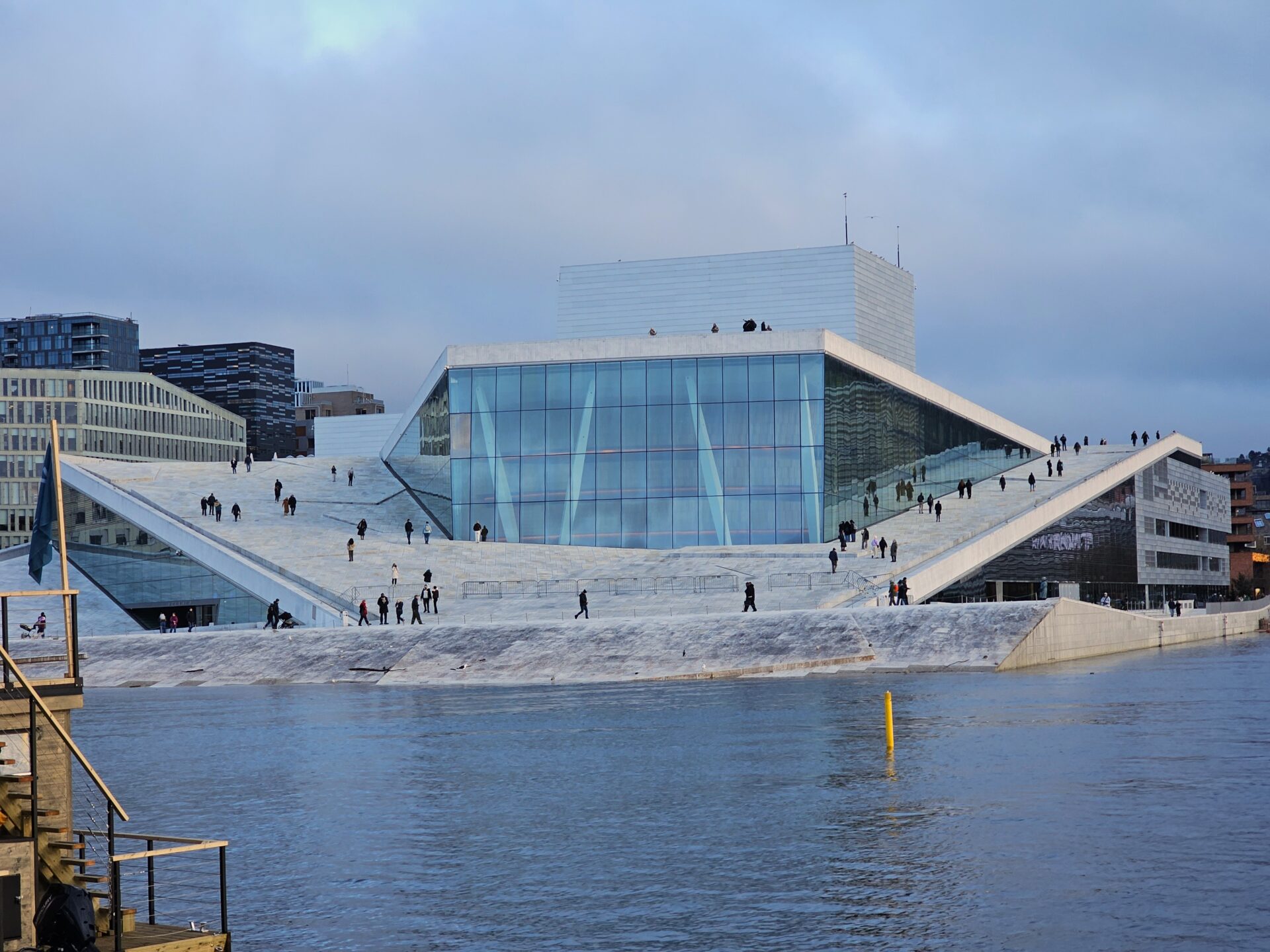 Η Όπερα απλώνεται και δεν υψώνεται. Λευκό μάρμαρο που κυλά από τη στεριά προς το φιόρδ, με μιά επιφάνεια που σε καλεί να την περπατήσεις, όχι μόνο να την κοιτάξεις. Το λιγοστό φως αντανακλάται απαλά στο άσπρο μάρμαρο και το κτίριο χαμηλώνει τους τόνους.