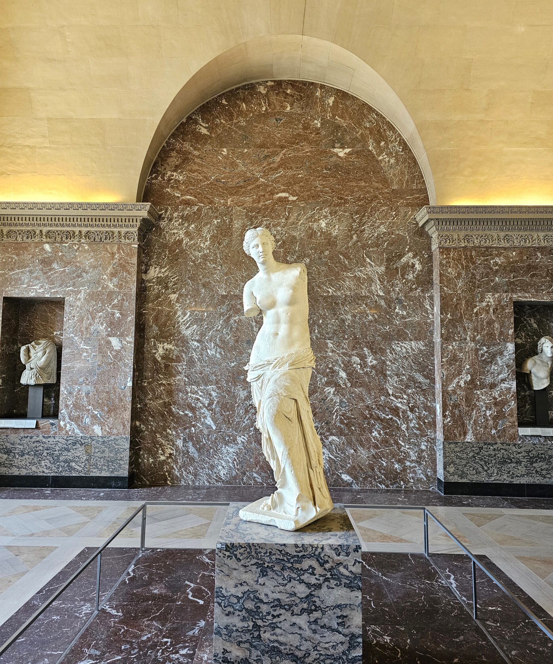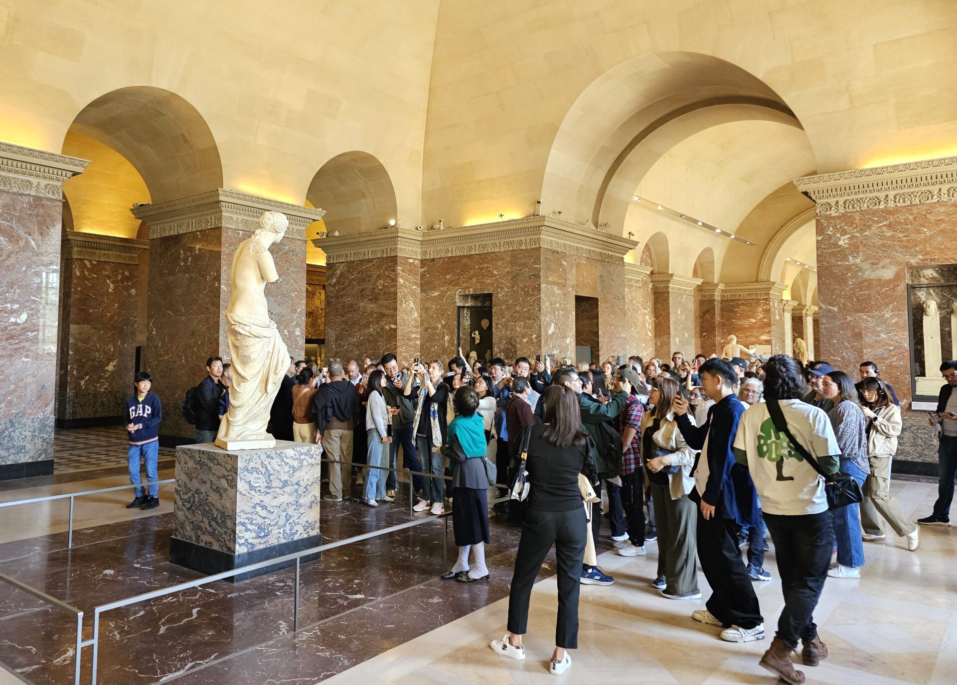 Μόλις μπήκαμε στο Λούβρο πρωί ακόμη για να μην έχει πολύ κόσμο, πήγαμε κατευθείαν στην Αφροδίτη. Η Αφροδίτη είναι μόνη στο τέλος μιας σειράς αγαλμάτων της Κλασσικής και Ελληνιστικής Ελλάδας. Πιστεύεται ότι την έφτιαξε ο Αλέξανδρος της Αντιοχείας για τον οποίο ξέρουμε ελάχιστα πράγματα. Λένε ότι το όνομα του υπήρχε στην πλίνθο, αλλά το εξαφάνισαν οι Γάλλοι για να μην υπάρχουν διεκδικήσεις. Είναι φτιαγμένη από εξαιρετικό Παριανό μάρμαρο σε δύο κομμάτια και η ένωση κρύβεται κάτω από το ύφασμα στους γλουτούς της Αφροδίτης. Έχει ύψος 2 μέτρα και της λείπουν τα χέρια, που ίσως χάθηκαν στην συμπλοκή για την απόκτηση της από τους Γάλλους στις ακτές της Μήλου . Έχουν γίνει πολλές έρευνες για το τι κρατούσε . Ίσως ένα μήλο; Ίσως έναν καθρέφτη; Μήπως έγνεθε ένα νήμα; Ότι και να έκανε δεν θα το μάθουμε ποτέ και νομίζω δεν ενδιαφέρει γιατί τα χέρια που λείπουν από ατέλεια, έγιναν προτέρημα.