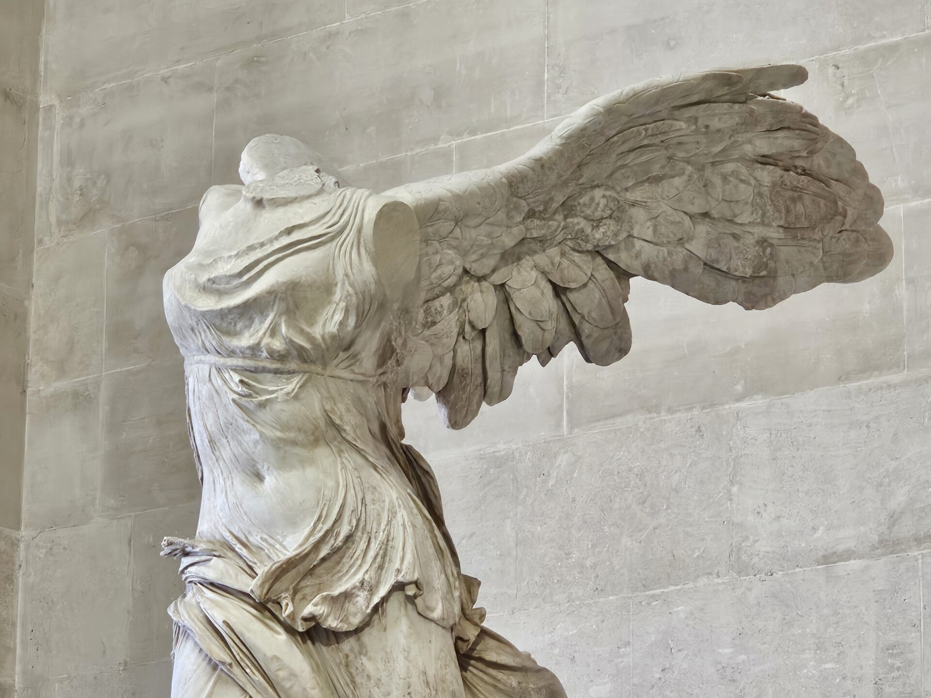 Η Νίκη είναι μόνη στο τέλος της επιβλητικής σκάλας Daru. Ανεβαίνοντας την σκάλα προς την Νίκη τα συναισθήματα μου είναι δύσκολο να ελεγχτούν από τις DNA καταβολές μου . Η Αρετή προσπαθεί να με ηρεμήσει . Την έχω φυσικά ξαναδεί και την Νίκη και την Αφροδίτη και τα έχουμε συζητήσει οι τρείς μας . H Νίκη ήταν αφιέρωμα ναυτικής νίκης μάλλον από Ροδίτες στο Ιερό των Μεγάλων Θεών . Η εκφραστική γλυπτική ικανότητα του άγνωστου καλλιτέχνη που σμίλεψε την Νίκη είναι εντυπωσιακή και την ζηλεύω . Το φτερωτό σώμα της λες και μόλις προσγειώθηκε στην πλώρη του πλοίου , με τα φτερά τεντωμένα ,και το αραχνοΰφαντο πέπλο να κολάει από τον αέρα πάνω στο αισθησιακό κορμί της . Η διαφάνεια και η κολλητικότητα των ρούχων της είναι αξεπέραστη. Η συναισθηματική εμπειρία να βλέπεις την Νίκη είναι πολύ δυνατή . Η Νίκη της Σαμοθράκης είναι ένα αριστούργημα της Ελληνιστικής τέχνης και σε πιάνει ένα δέος όταν την βλέπεις . Είναι σαν ένας φτερωτός ταξιδιώτης στον χρόνο . Η Νίκη το 2014 μπήκε σε ινστιτούτο αισθητικής για να γίνει πιο όμορφη . Το Λούβρο μάζεψε 1 εκατ. ευρώ από crowndfunding , έβαλε άλλα 3 εκατ. και “ γυάλισε “ την Νίκη, δηλαδή άσπρισε το άγαλμα. Θεωρείται λάθος παρέμβαση γιατί χάθηκε η πατίνα του χρόνου, το βάθος και η πλαστικότητα του αγάλματος .