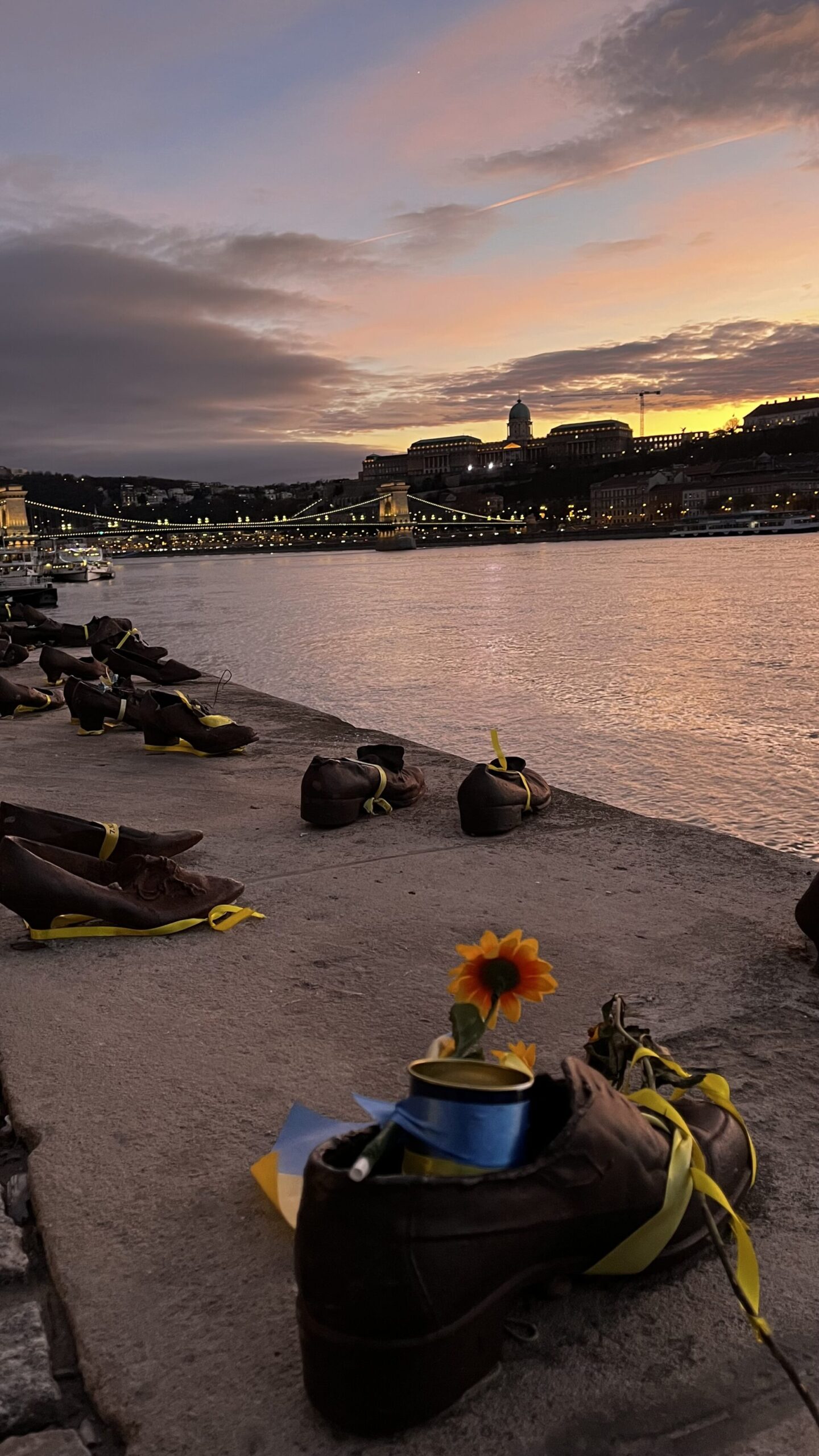 Η όψη από τα Παπούτσια στην όχθη του Δούναβη, σου κόβει την ανάσα, καθώς με μία μόνο ματιά, μπορείς να αισθανθείς την ιστορία και τον πόνο της πόλης. Το μνημείο αυτό, ανεγέρθηκε στις 16 Απριλίου 2005 στη μνήμη των Εβραίων που σφαγιάστηκαν από φασιστικές ουγγρικές πολιτοφυλακές που ανήκαν στο Κόμμα Βελωτού Σταυρού, κατά τη διάρκεια του Δεύτερου Παγκόσμιου Πολέμου. Τους διέταξαν να βγάλουν τα πολύτιμα παπούτσια τους – τα οποία μπορούσαν να κλαπούν και να μεταπωληθούν από την πολιτοφυλακή μετά τη σφαγή – και τους πυροβόλησαν στην άκρη της όχθης, με αποτέλεσμα τα σώματά τους να πέσουν στο ποτάμι και να παρασυρθούν. Το μνημείο αυτό, σχεδιασμένο από τον Καν Τόγκαϊ, αντιπροσωπεύει τα παπούτσια τους που άφησαν πίσω, στην ανατολική όχθη του Ποταμού.