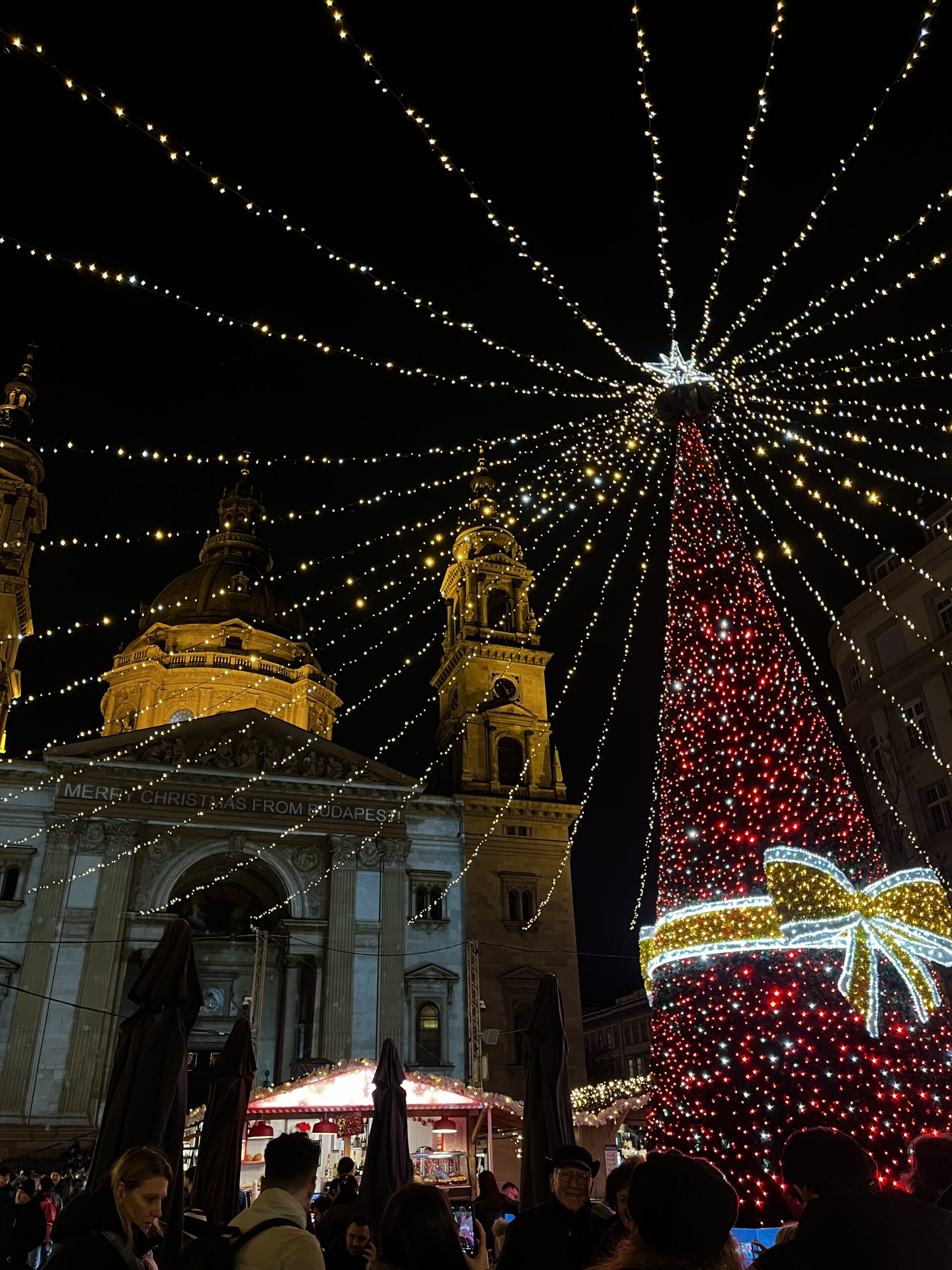 Από την άλλη, σε αυτή τη γειτονιά, αντικρίζεις και τον ιστορικό πλούτο της Βουδαπέστης, μιας και στα βήματά σου θα συναντήσεις τα κτίρια της Βουλής και την εντυπωσιακή εκκλησία του Αγίου Στεφάνου. Οι χριστουγεννιάτικες μελωδίες μας οδήγησαν απευθείας σε ακόμα ένα christmas market, αυτό που βρισκόταν μπροστά ακριβώς από μεγαλύτερο εκκλησιαστικό κτήριο στη σημερινή Ουγγαρία, το οποίο όταν έπεσε το φως της ημέρας, στολίστηκε από ένα φαντασμαγορικό σόου με φώτα, που ανέγραφαν «Merry Christmas From Budapest» πάνω στην νεοκλασική αρχιτεκτονική του εξωτερικού του.