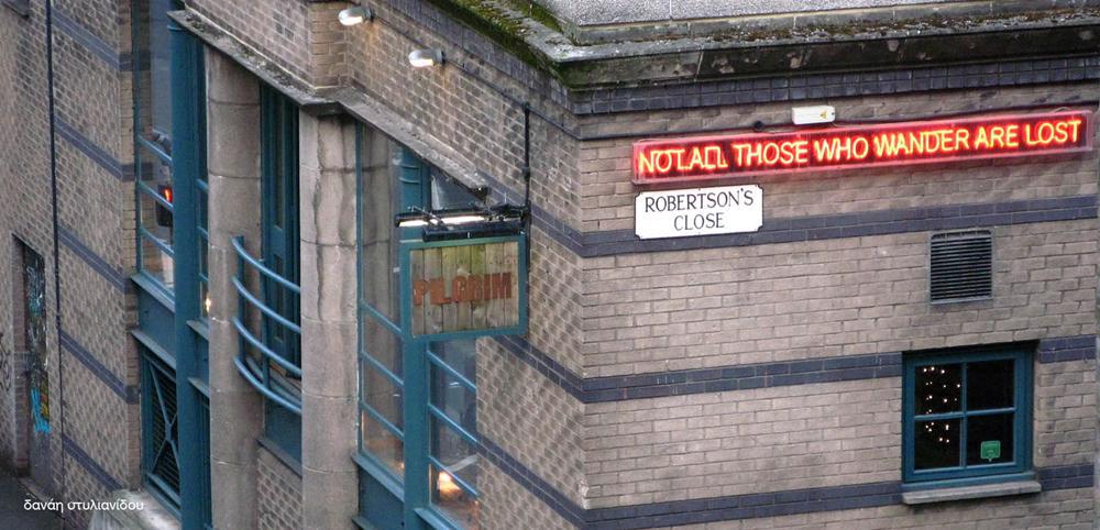 Αυτή τη σκέψη (στην ελληνική και στην πιο αφηρημένη της version) την έχω τα τελευταία χρόνια στο μυαλό μου. Σε ανύποπτο χρόνο, γνώρισα έναν άνθρωπο που σκέφτεται και νιώθει αυτή τη φράση με τον ίδιο τρόπο όπως και εγώ και σίγουρα διαβάζοντάς το τώρα χαμογελάει όπως και εγώ. Όταν σε μια τόσο δική μου σκέψη, ανακαλύπτω πως με νιώθει ένας άνθρωπος, εκπλήσσομαι ευχάριστα. Έπειτα, ανακαλύπτω πως ο Τόλκιν έχει μεταφέρει σε λέξεις αυτή που νόμιζα πολύ δική μου (ή έστω δική μας) σκέψη. Το αποκορύφωμα έρχεται όταν μόλις έχω αγοράσει την καρό φούστα, που σου ανέφερα πιο πριν, βλέπω τη συγκεκριμένη πρόταση σε επιγραφή με μεγάλα νέον γράμματα…στο Εδιμβούργο!