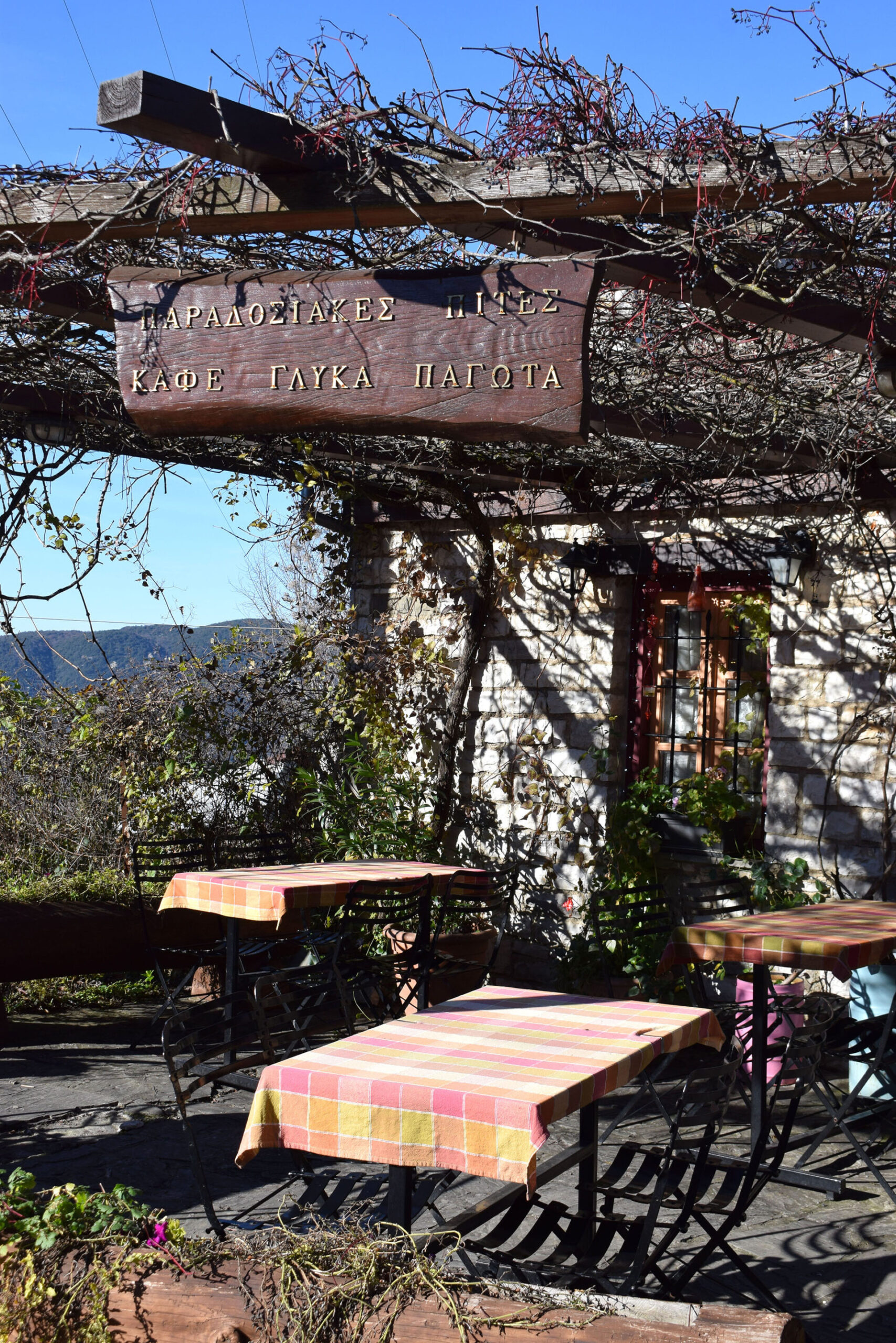 Το κατάλυμα στο οποίο διαμέναμε, αποτελεί χαρακτηριστικό παράδειγμα αυτού του “παντρέματος”. Βρίσκεται στην κεντρική πλατεία του χωριού, ένα σημείο αρκετά προβεβλημένο, και όχι άδικα, αφού κάνει πραγματικότητα την φαντασίωση κάθε ταξιδιώτη που στο άκουσμα των ορεινών χωριών, φαντάζεται μια πλακόστρωτη πλατεία, γεμάτη τραπεζοκαθίσματα και θαμώνες που απολαμβάνουν καφέ και γλυκό του κουταλιού, υπό τον ίσκιο ενός μεγάλου πλατάνου.
