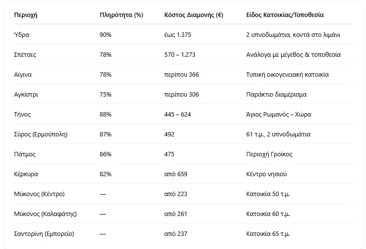 Στον Αργοσαρωνικό, η Ύδρα καταγράφει πληρότητα 90%, με τις Σπέτσες να ακολουθούν με 78%. Οι τιμές για τριήμερη διαμονή κυμαίνονται από 1.375 ευρώ στην Ύδρα για κατοικία δύο υπνοδωματίων, έως και 1.273 ευρώ στις Σπέτσες.