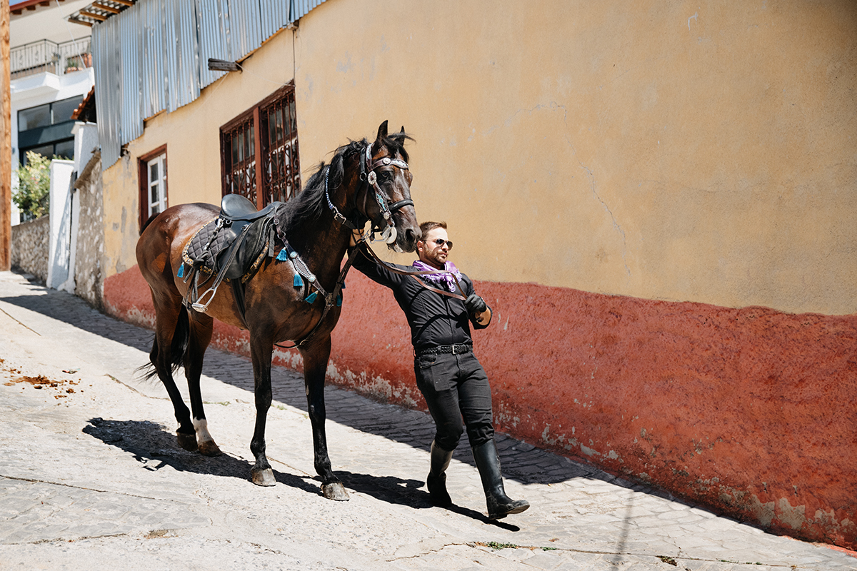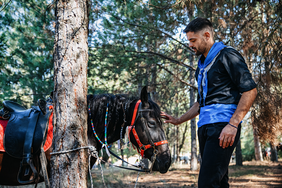 Βάζουν μετά όλα τα απαραίτητα στολίδια, γιορντάνια, χαμαϊλιά, κουδουνάκια, καπίστρι ρουμπινένιο με oυρά ασβού στο μέτωπο του αλόγου και τα κεντημένα χαλινάρια. Απαραίτητο, δε, συμπλήρωμα του στολισμού είναι τα λουλούδια της εποχής, ζουκούμια και λιοβότανα. Αφού ντυθούν και οι ίδιοι με τις όμορφες φορεσιές στη μέση, το ζωνάρι και στο λαιμό μεταξωτό μαντήλι πού πέφτει τριγωνικά πίσω στην πλάτη, πλεκτό γκορμπάτσι (μαστίγιο) επιδέξια πλεγμένο και την τσότρα με το κρασί κρεμασμένη στον ώμο, ανεβαίνουν στα άλογα. Μπροστά τα όργανα και πίσω οι καβαλάρηδες.