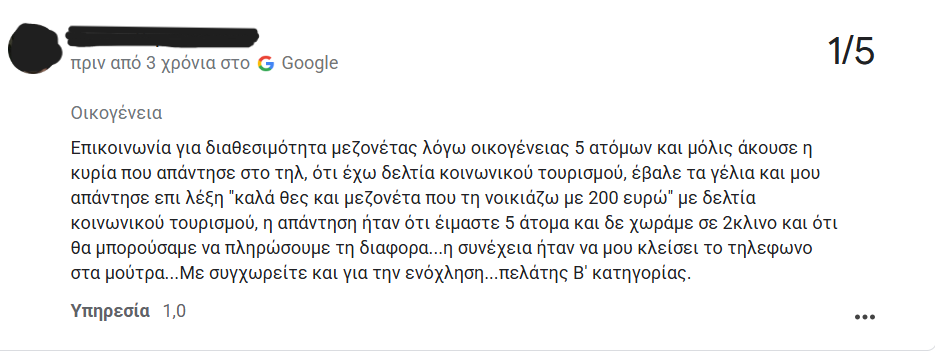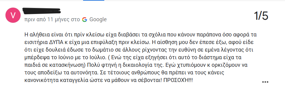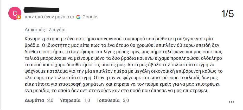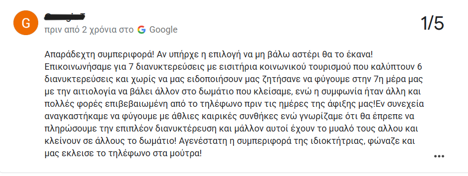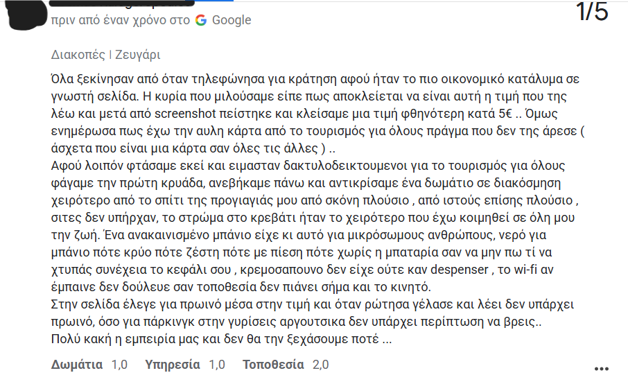 Τα συγκεκριμένα καταλύματα, από τις κριτικές που είδα αργότερα, είχαν συμπεριφερθεί με παρόμοιο τρόπο σε πολλούς πελάτες, ζητώντας επιπλέον χρήματα στο τέλος της διαμονής τους, ενώ σε άλλους ακύρωναν τις ημερομηνίες που είχαν κλείσει ή τους έλεγαν ότι μπορούν να μείνουν λιγότερες ημέρες από αυτές που είχαν κάνει αρχικά κράτηση».
