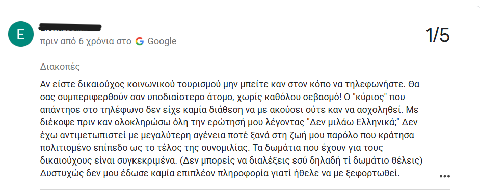 «Πήρα το επίδομα κοινωνικού τουρισμού και ήθελα να κλείσω κάποιες ημέρες για διακοπές στο δεύτερο πόδι της Χαλκιδικής. Μπήκα λοιπόν στο site του κοινωνικού τουρισμού και άρχισα να παίρνω τηλέφωνα στα ξενοδοχεία που ήταν στην λίστα για τη συγκεκριμένη περιοχή.