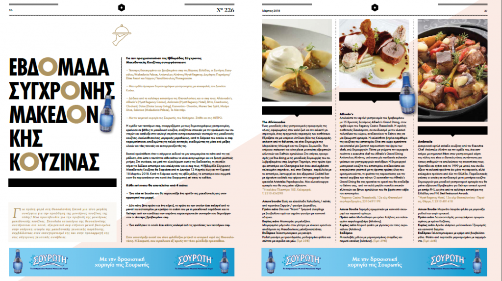 Αφιέρωμα στην προσπάθεια σπουδαίων εστιατορίων και μεγάλων σεφ της πόλης, στο πλαίσο της συνέργειά τους για πρώτη φορά στην Θεσσαλονίκη, για την ανάδειξη της γαστρονομικής ταυτότητας της Μακεδονίας μέσω της Εβδομάδας Σύγχρονης Μακεδονικής Κουζίνας.