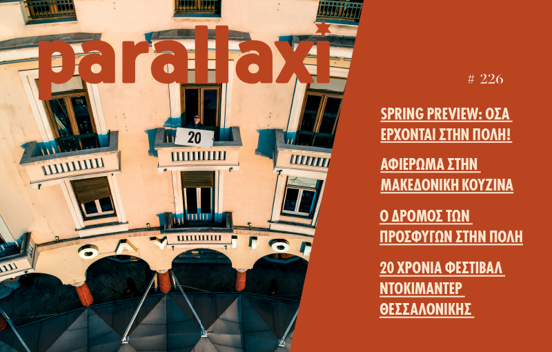 Η Parallaxi για τον Μάρτιο 2018 υποδέχεται την Άνοιξη με τον καλύτερο οδηγό για την νέα σεζόν στην πόλη, κάνει ένα γευστικό αφιέρωμα στην νέα μακεδονική κουζίνα, ακολουθεί τον δρόμο των μεταναστών στην Θεσσαλονίκη σε ένα εξαιρετικό ρεπορτάζ, ενώ αφιερώνει τόσο το εξώφυλλο όσο και την ματιά της στην συμπλήρωση 20 χρόνων του Φεστιβάλ Ντοκιμαντέρ με τον πληρέστερο οδηγό του.