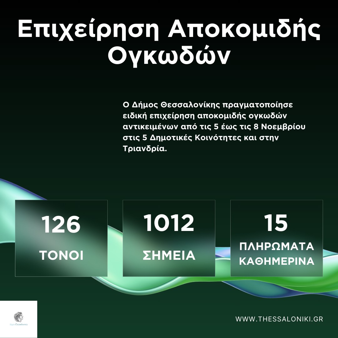 «Αυτός είναι ο απολογισμός της ειδικής επιχείρησης αποκομιδής ογκωδών αντικειμένων που πραγματοποίησε ο Δήμος Θεσσαλονίκης μεταξύ 5 και 8 Νοεμβρίου, σε όλες τις Δημοτικές Κοινότητες και την Τριανδρία.