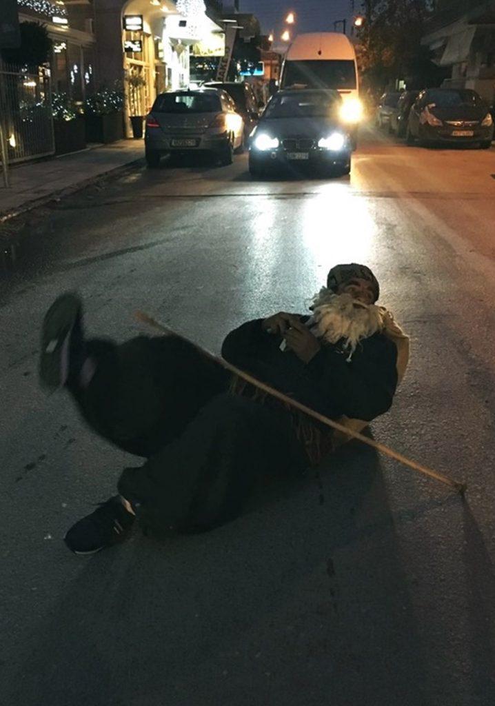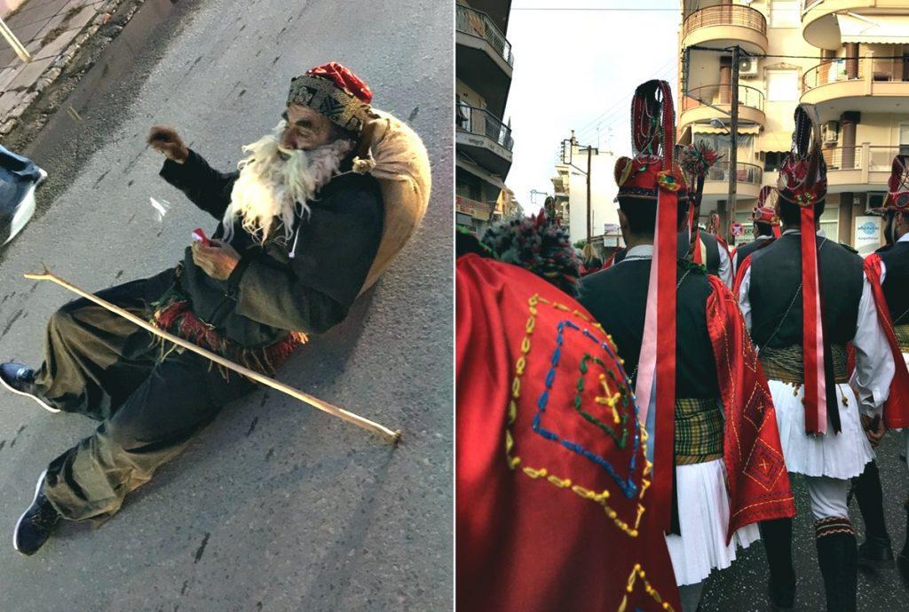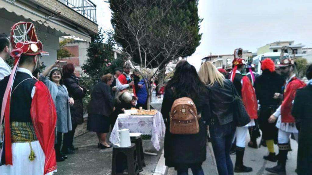 Τραπέζια, μεζέδες και τσίπουρα βγήκαν στα πεζοδρόμια μπροστά από σπίτια -το street food μάλλον στην βάση του- και μια ομάδα περίπου είκοσι νέων από τον Τετράλοφο Κοζάνης*, ντυμένοι όπως επιβάλλει το έθιμο συνοδεία ποντιακής μουσικής έκαναν πέρασμα στους δρόμους της περιοχής παρουσιάζοντας το δρώμενο, κάνοντας αυτοσχεδιασμούς μεταξύ τους, με οικοδεσπότες και περαστικούς.