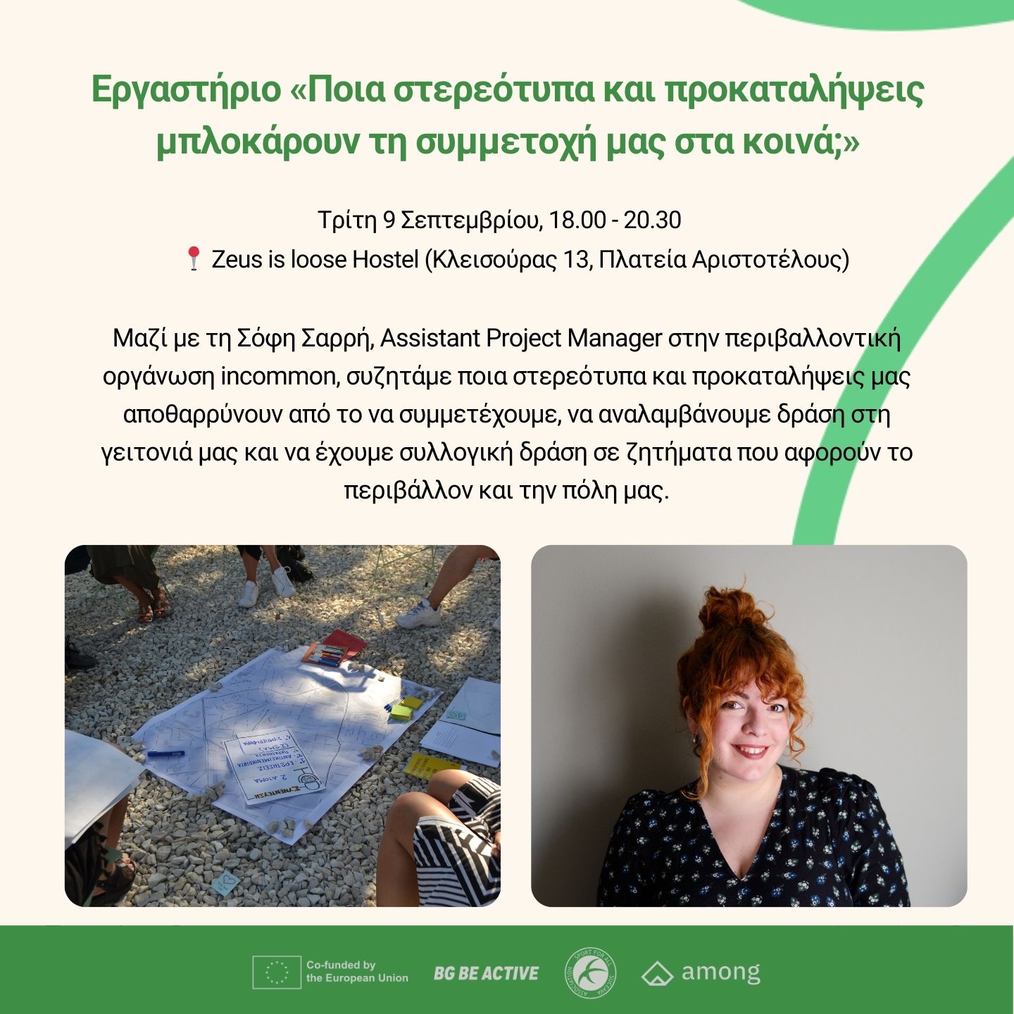Μαζί με τη Σόφη Σαρρή, Assistant Project Manager στην περιβαλλοντική οργάνωση incommon, συζητάμε ποια στερεότυπα και προκαταλήψεις μας αποθαρρύνουν από το να συμμετέχουμε, να αναλαμβάνουμε δράση στη γειτονιά μας και να έχουμε συλλογική δράση σε ζητήματα που αφορούν το περιβάλλον και την πόλη μας.