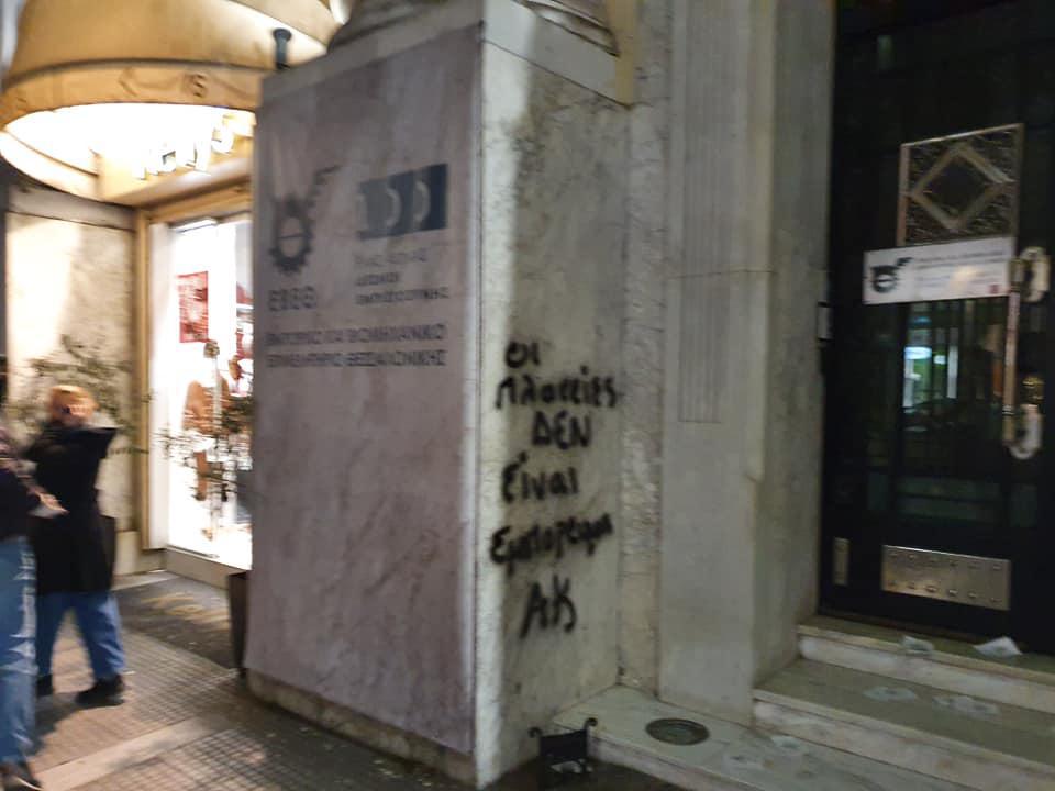 Παρέμβαση αντεξουσιαστών χθες στο Εμπορικό και Βιομηχανικό Επιμελητήριο Θεσσαλονίκης με σπρέι και τρικάκια.