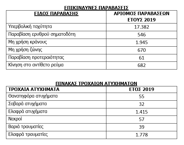 Σύμφωνα με τα αποτελέσματα αυτών προκύπτει πως στην κορυφή των επικίνδυνων παραβάσεων του περασμένου έτους βρίσκεται η υπερβολική ταχύτητα με 17.382 παραβάσεις. Δεύτερη ακολουθεί η μη χρήση κράνους και τρίτη η μη χρήση ζώνης.