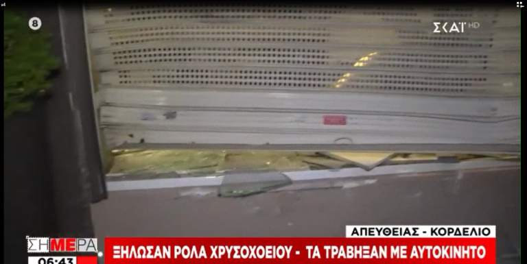 Σήμερα λίγο πριν τις 5 τα ξημερώματα της Τρίτης, άγνωστοι δράστες με αυτοκίνητο τράβηξαν τα ρολά κοσμηματοπωλείου μπροστά στα μάτια των κατοίκων που, όπως λέει στο ρεπορταζ ο πατέρας του ιδιοκτήτη, άκουσαν τον θόρυβο από το τράβηγμα των ρολών. Η διάρρηξη σημειώθηκε σε κεντρικό δρόμο στο Ελευθέριο Κορδελιό στη Θεσσαλονίκη στην οδό Ανδρέα Παπανδρέου.