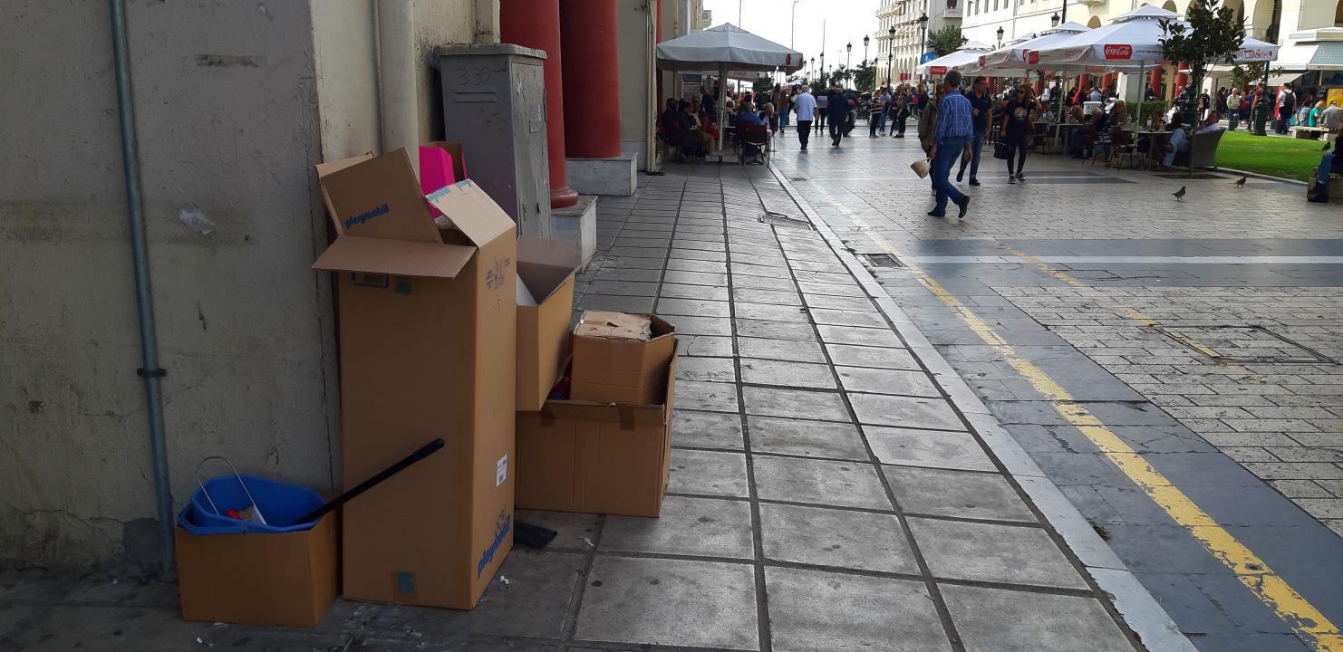 Στους εμπορικούς δρόμους σε κάθε γωνία θα δεις στοιβαγμένες κούτες από τα μαγαζιά στο πεζοδρόμιο να «στολίζουν» την εικόνα των τουριστικών δρόμων. Είτε ο κάδος ανακύκλωσης ήταν μακριά είτε «έπεσε» πολύ δουλειά στο μαγαζί…