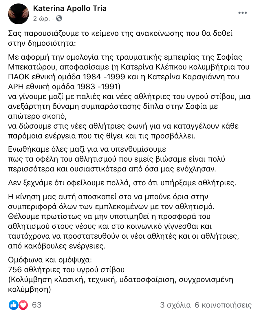 Φαίνεται πως οι δονήσεις που έχουν προκαλέσει οι αποκαλύψεις της Σοφίας Μπεκατώρου είναι πλέον ισχυρές και διαδοχικές. Στο προσκήνιο έρχεται σήμερα η αθλητική κοινωνία της Θεσσαλονίκης. Δύο παλιές κολυμβήτριες, από ανταγωνιστικές ομάδες μια του ΠΑΟΚ και μια του ΆΡΗ, ένωσαν τις δυνάμεις τους και συγκέντρωσαν 756 αθλήτριες σε μια κοινή ανακοίνωση με πολλαπλούς αποδέκτες.
