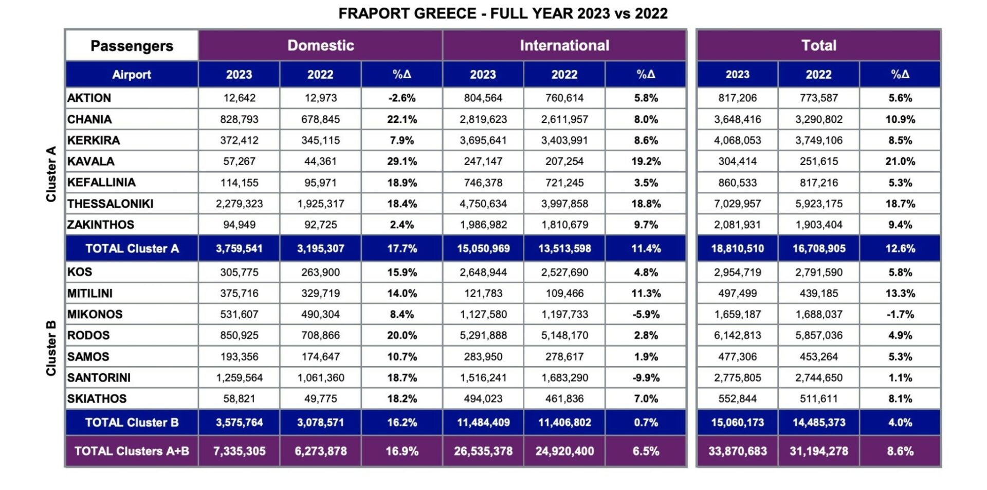 Συνολικά η επιβατική κίνηση στα 14 περιφερειακά αεροδρόμια (Ακτιο, Χανιά, Κέρκυρα, Καβάλα, Κεφαλλονιά, Θεσσαλονίκη, Ζάκυνθος, Κως, Μυτιλήνη, Μύκονος, Ρόδος, Σάμος, Σαντορίνη, Σκιάθος) ξεπέρασε για το σύνολο του 2023 τα 33,87 εκατομμύρια επιβάτες, αυξημένη κατά 8,6% έναντι των 31,2 εκατ. του αμέσως προηγούμενου έτους, ενώ σε σχέση με τα 30,16 εκατ. επιβάτες του 2019, προ πανδημίας, η αύξηση τοποθετείται στο +12,3%.