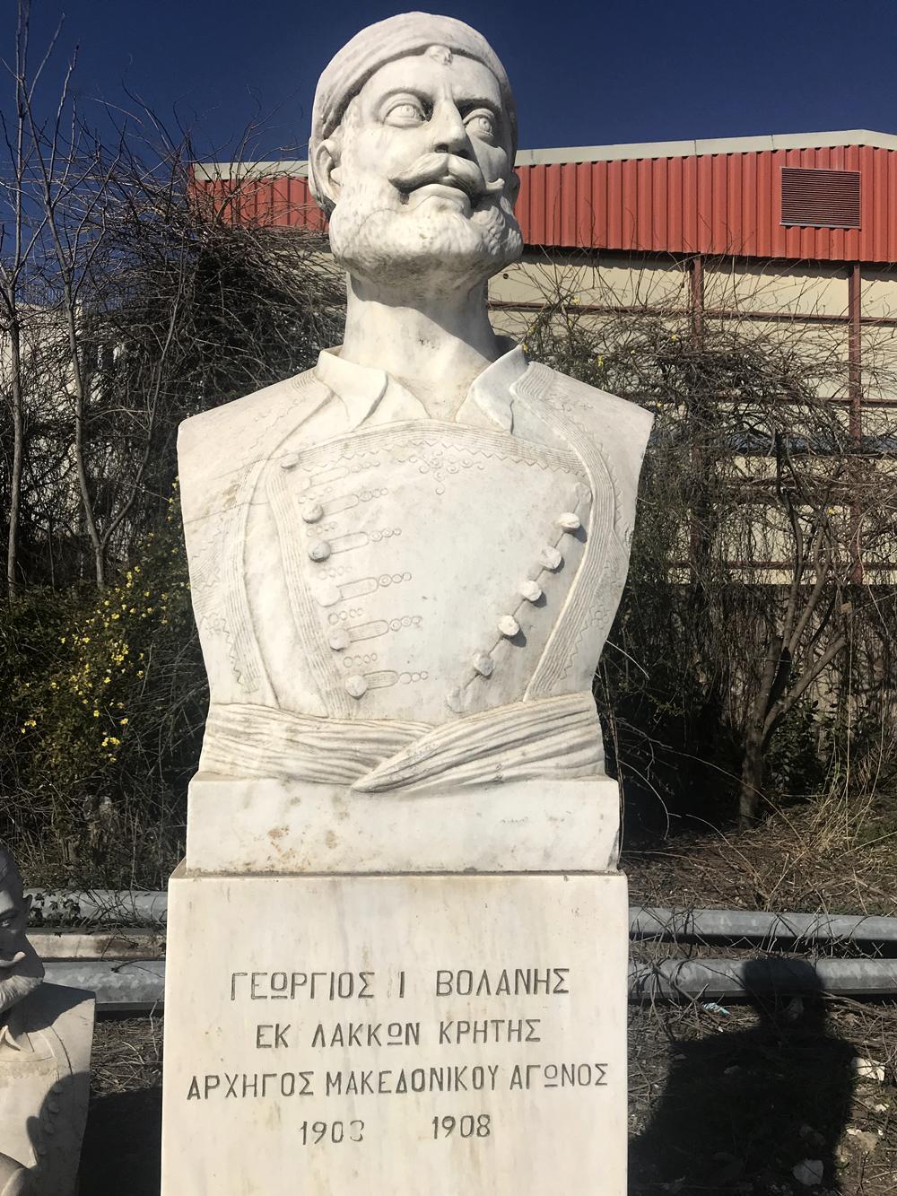 H προτομή του Βολάνη είναι έργο του 1953, του γλύπτη Γιάννη Κανακάκη. Ο Βολάνης, από οικογένεια που διακρίθηκε στις κρητικές επαναστάσεις, πήρε μέρος στον Μακεδονικό αγώνα, στο ένοπλο σώμα του Παύλου Μελά. Συνελήφθη αιχμάλωτος και οδηγήθηκε στο Μοναστήρι απ’ όπου κατάφερε να δραπετεύσει. Συνέχισε τον αγώνα με δικό του σώμα εναντίον των Βουλγάρων και Τούρκων. Δολοφονήθηκε στην Κρήτη το 1943, όπως λέγεται από κομμουνιστές αντάρτες, χωρίς αυτό να είναι επιβεβαιωμένο. Για τον Βολάνη σώζεται Μακεδονικό δημοτικό που αναφέρεται στη μάχη του Στρεμπένου.