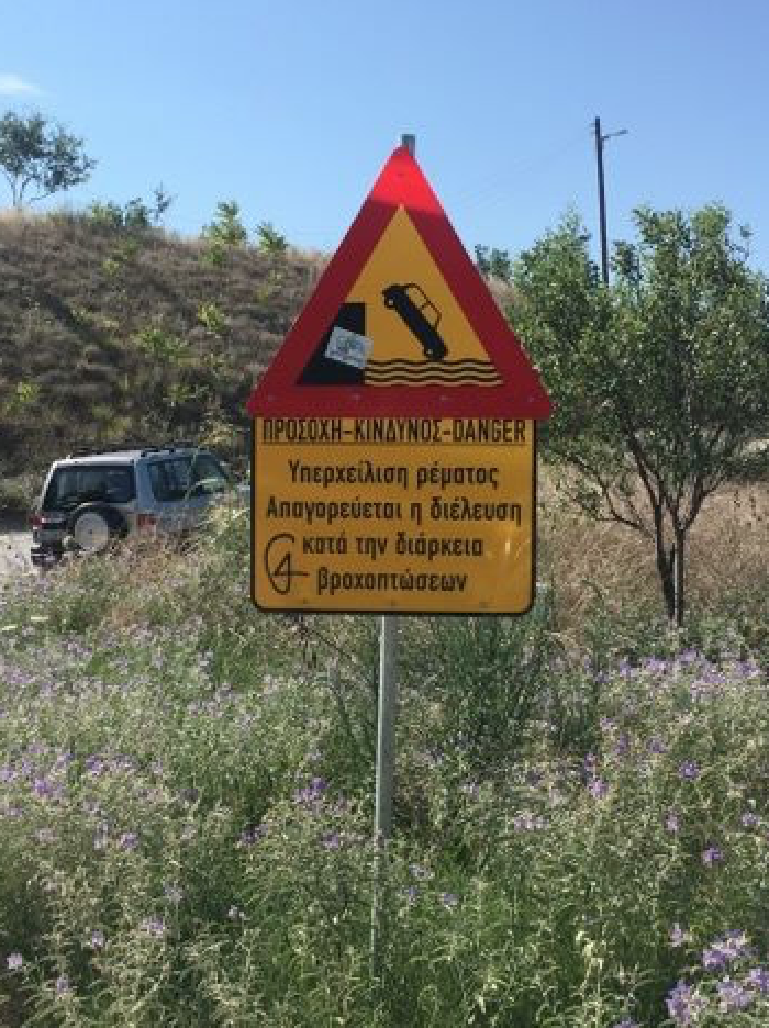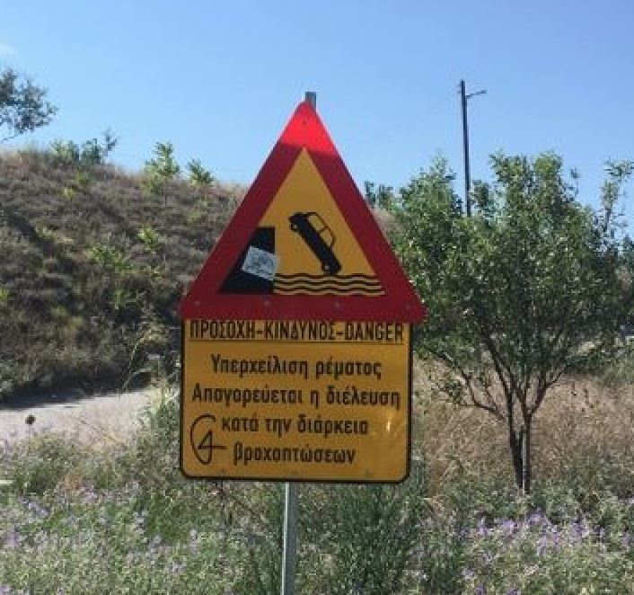 Μια ασυνήθιστη πινακίδα, από αυτές που συναντάς σε εξοχές και λαγκάδια βρίσκεται μέσα στην πόλη της Θεσσαλονίκης. Στην περιοχή Αλατίνη, στα σύνορα Χαριλάου-Πυλαίας, επί της οδού Γεννηματά, αυτή η πινακίδα προειδοποιεί για την επικίνδυνη διέλευση των οχημάτων όταν βρέχει. Η περιοχή μετατρέπεται συχνά σε λίμνη, με αποτέλεσμα οι οδηγοί να ρισκάρουν πραγματικά οδηγώντας και αψηφώντας την προειδοποίηση.