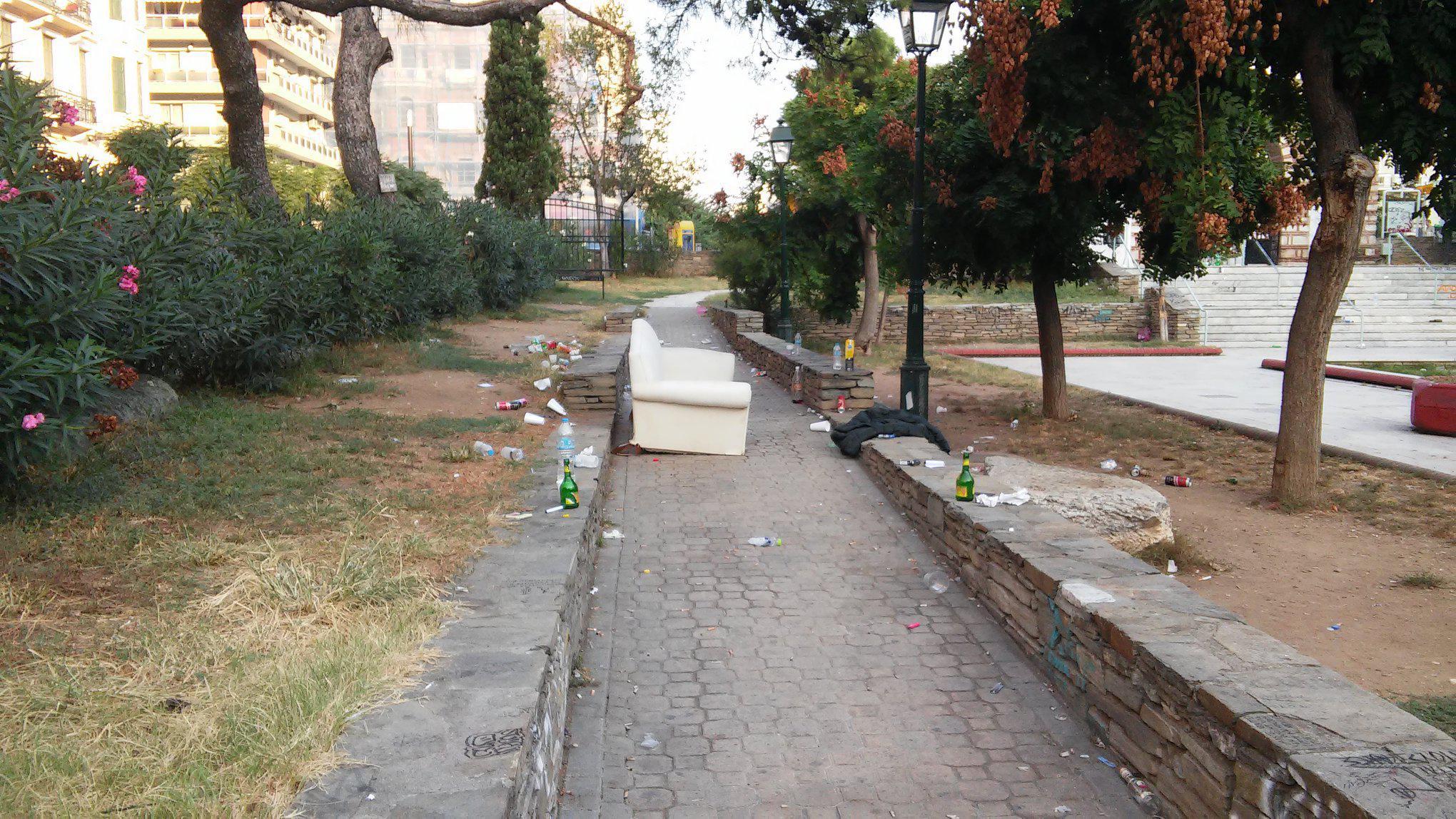 Δευτέρα πρωί. Αυλόγυρος Αγίας Σοφίας. Θεσσαλονίκη. Τα γνωστά απομεινάρια κάθε νύχτας. Άδεια μπουκάλια, ποτήρια, σύριγγες, πακέτα από τσιγάρα. Και ένα new entry. Αστική επίπλωση. Ένας καναπές που μεταφέρθηκε εκεί χθες βράδυ για να συμπληρώσει την εικόνα. Να γίνει η απόλαυση λίγο καλύτερη. Ο καναπές μεταφέρθηκε από γειτονικό πεζοδρόμιο, αφού όλη η πόλη ανακαινίζεται για να γίνει ενοικιαζόμενο airbnb οπότε όλα της τα πεζοδρόμια είναι γεμάτα έπιπλα που κατεβάζει ο καθένας με άνεση…