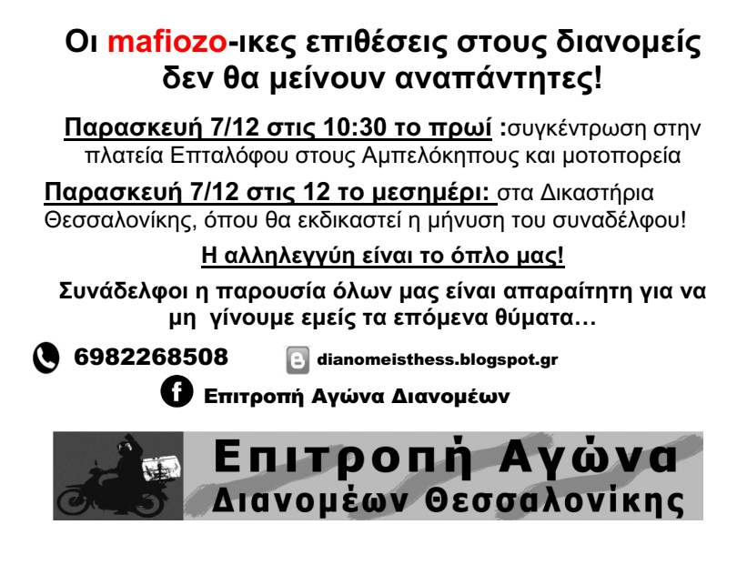 Να σημειωθεί πως οι διανομείς υποστηρίζουν ότι είναι το δεύτερο περιστατικό ξυλοδαρμού στη Θεσσαλονίκη μέσα σε δύο μήνες και ζητούν την παρέμβαση του υπουργείου Εργασίας για το συγκεκριμένο συμβάν, την άμεση έκδοση της εγκυκλίου για ζητήματα υγιεινής και ασφάλειας που, όπως λένε, τους έχουν υποσχεθεί από το αρμόδιο υπουργείο και την εντατικοποίηση των ελέγχων από το ΙΚΑ και την Επιθεώρηση Εργασίας για την αδήλωτη και ανασφάλιστη εργασία.