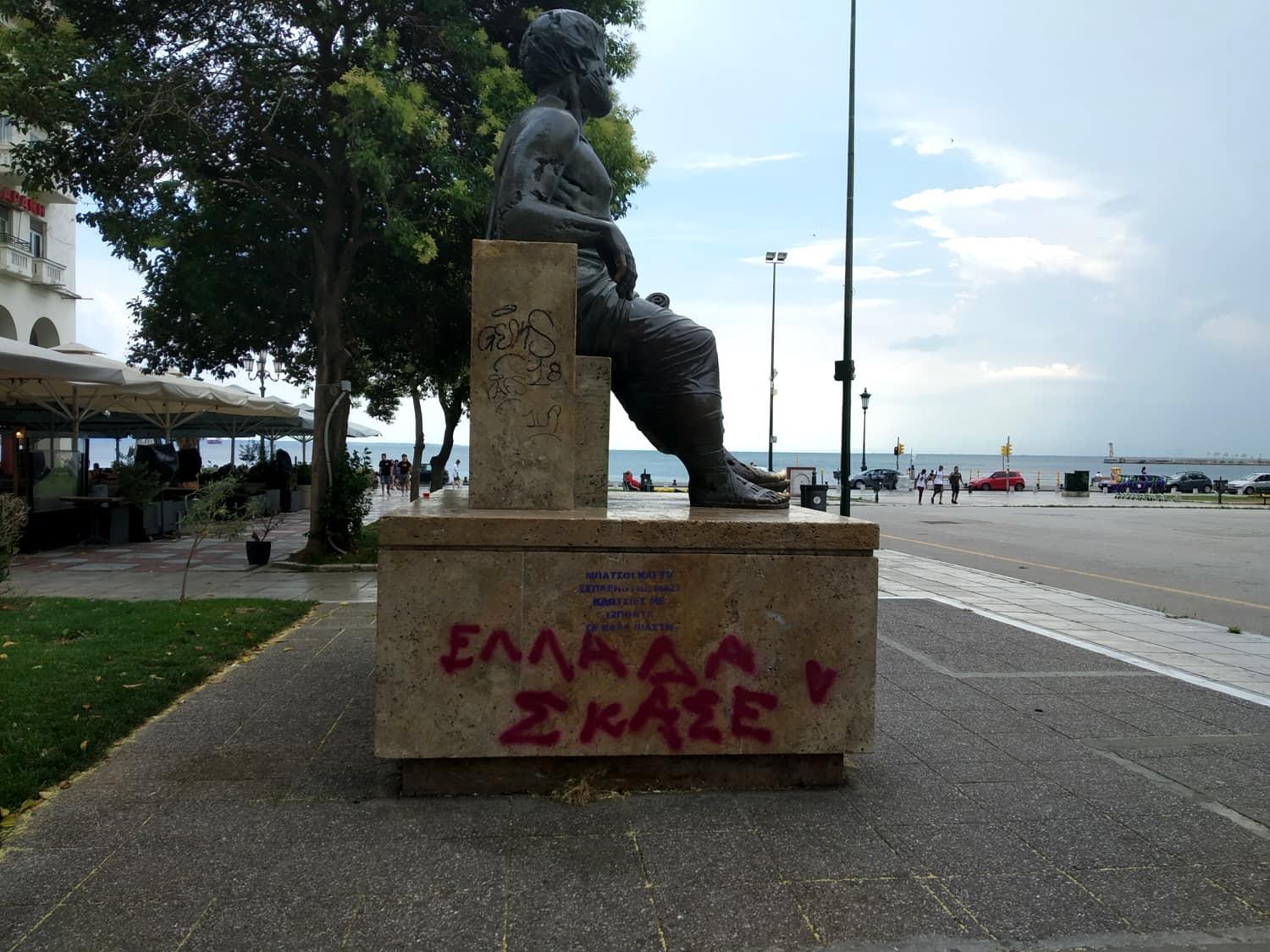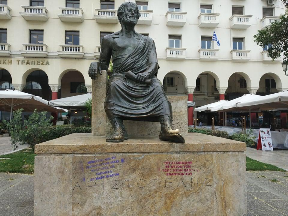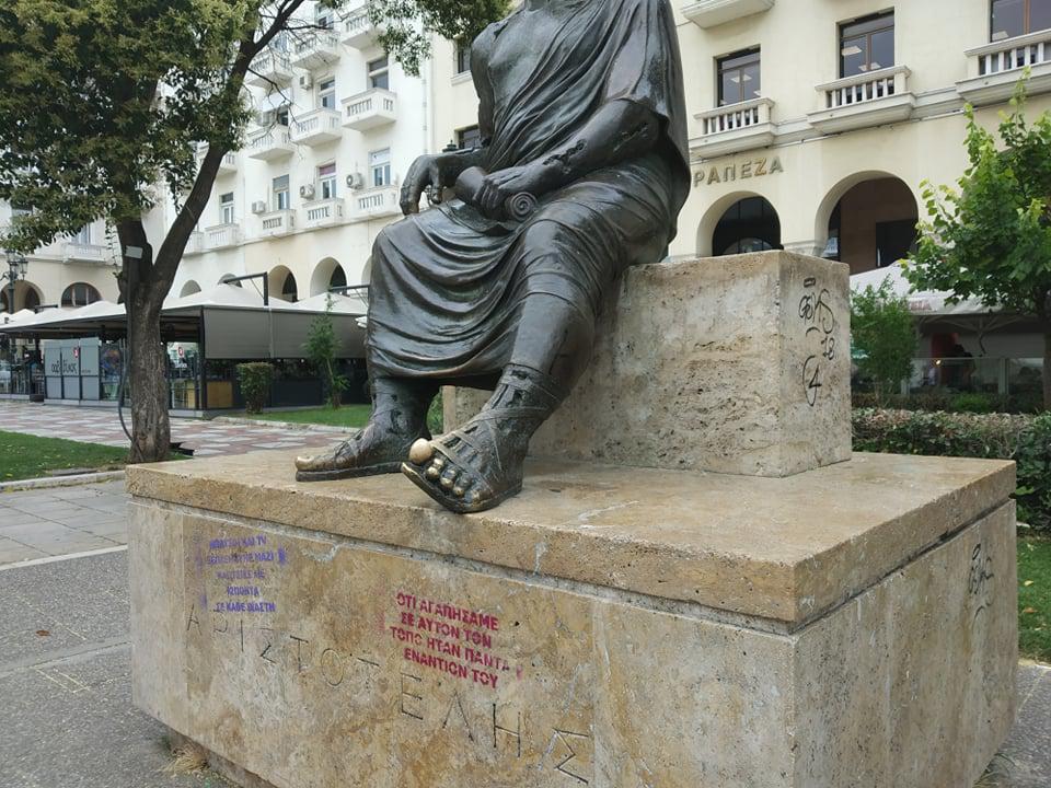 Με συνθήματα και στένσιλ βανδάλισαν άγνωστοι το άγαλμα του Αριστοτέλη στην Πλατεία Αριστοτέλους, γεμίζοντας με κατακριτέες εικόνες τον δημόσιο χώρο.
