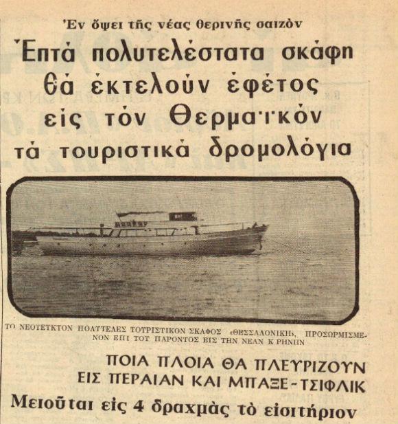 Εικόνα των σκαφών που πηγαινοέρχονται στον Θερμαϊκό είναι ειδυλλιακή και οι Θεσσαλονικείς ξέρουν τα καραβάκια με τα ονόματά τους: Μακεδονία, Ελλήσποντος, Νεράιδα, Φανούλα, Καμέλια, Σοφία, Άγιος Νικόλας, Μεταμόρφωση, Άγιος Βασίλειος, Ναυτίλος, Λευκή, Ιουλία, Ελπίδα, Ευδοκία, Αλέκος, Θεσσαλονίκη. Τα καραβάκια έφευγαν κάθε 20 λεπτά από την προκυμαία του Λευκού Πύργου και μετά από μισή ώρα “έπιαναν” Περαία, Μπαξέ και Αγία Τριάδα.