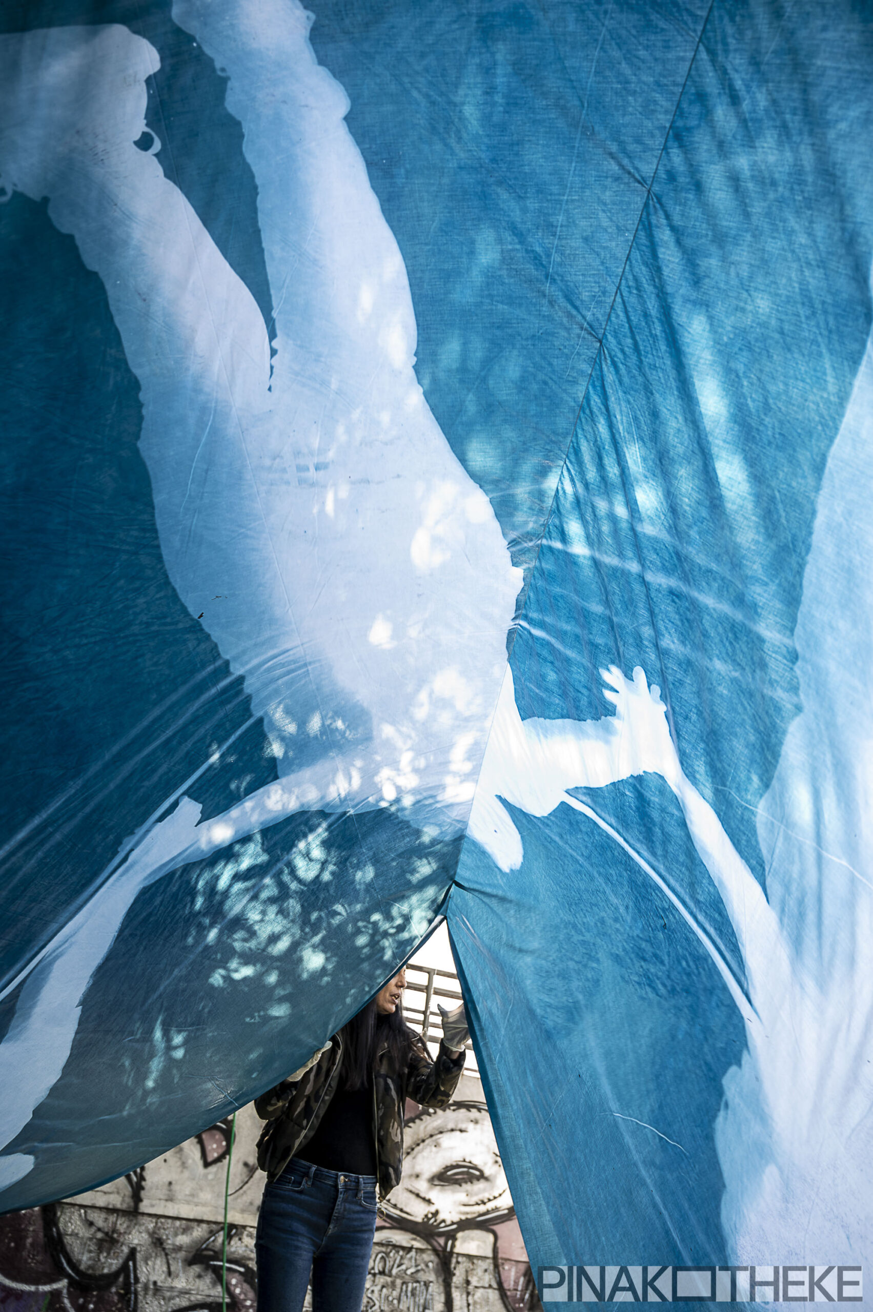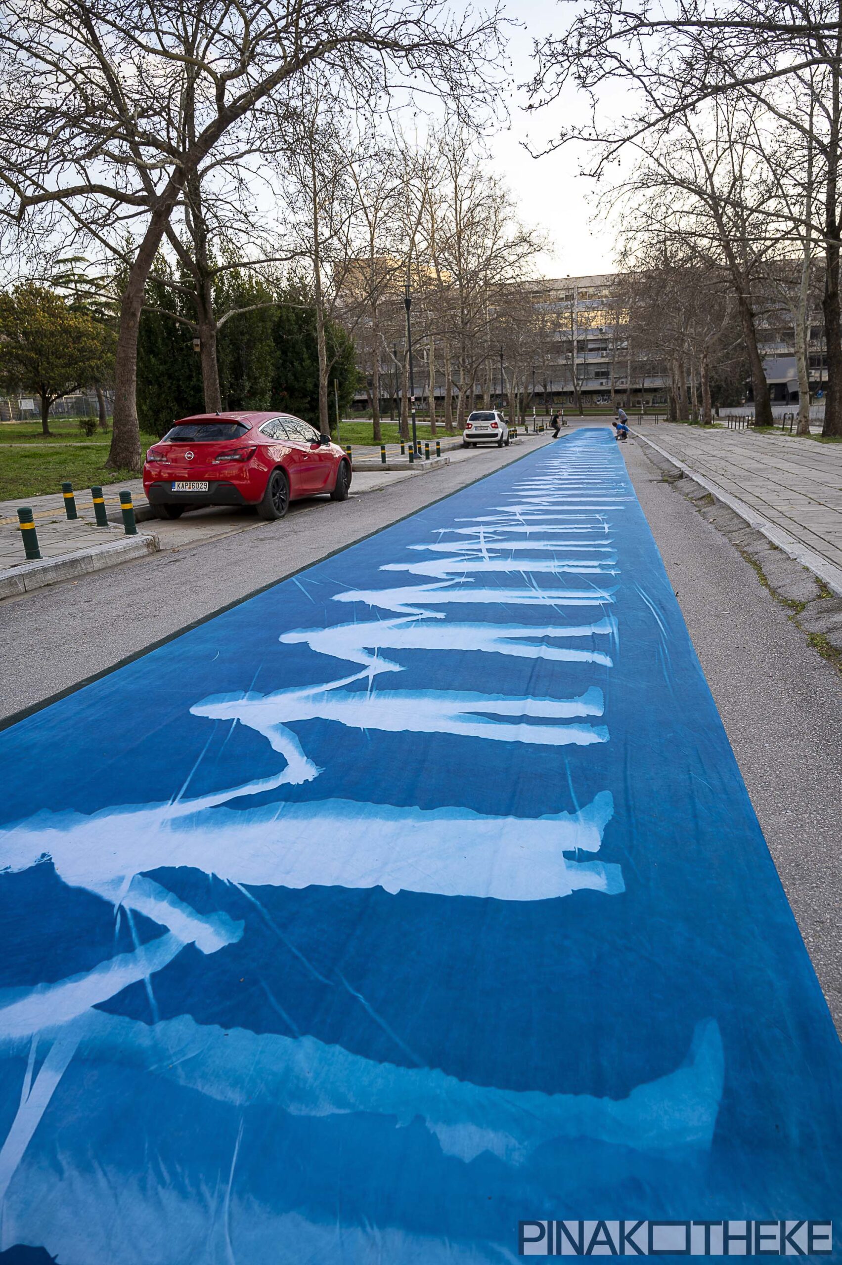 Μια ανθρώπινη αλυσίδα φτιαγμένη από σώματα που κρατιούνται από το χέρι, σε ένα ειδικά προετοιμασμένο πανί 102 μέτρων, δημιούργησε η φωτογραφική ομάδα της gallery Pinakotheke, με τη χρήση της τεχνικής της κυανοτυπίας, εις μνήμην των ανθρώπων που έχασαν τη ζωή τους το βράδυ της 28ης Φεβρουαρίου στα Τέμπη.