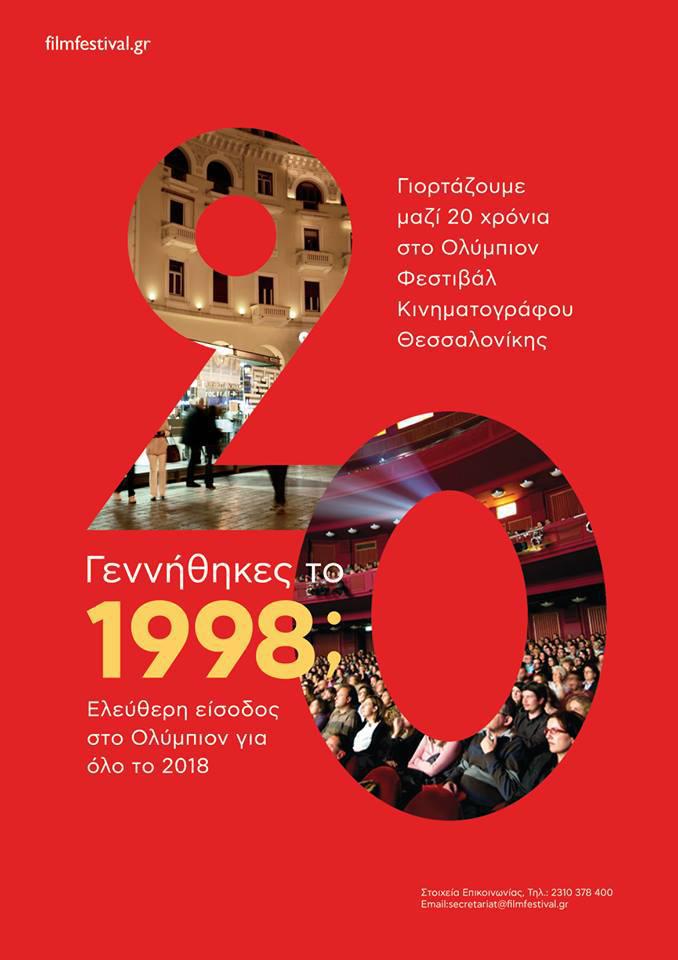 Το Διεθνές Φεστιβάλ Κινηματογράφου Θεσσαλονίκης γιορτάζει τα 20 του χρόνια στο Ολύμπιον, μαζί με τους… συνομηλίκους του. Έτσι αν γεννήθηκες την τυχερή χρονιά του 1998, έχεις ελεύθερη είσοδο στις προβολές του Φεστιβάλ Κινηματογράφου στο Ολύμπιον.
