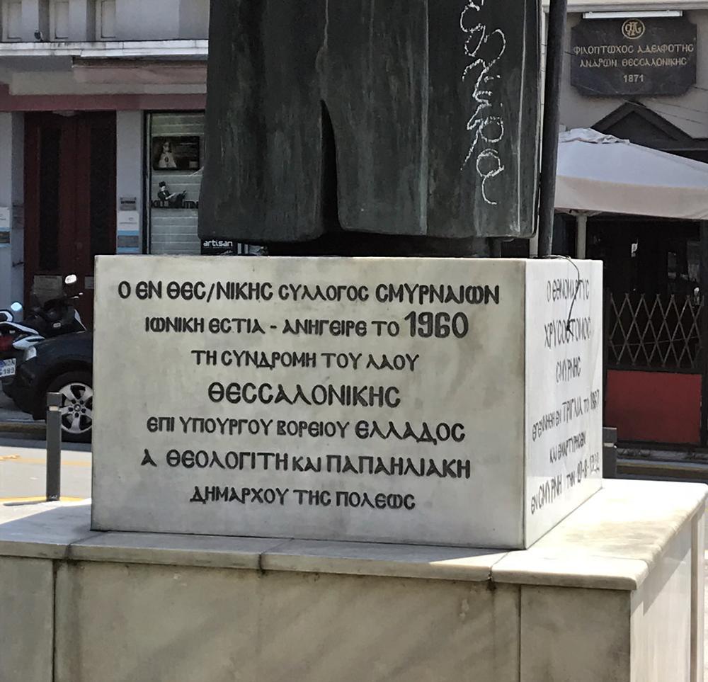 Στην μαρμάρινη βάση διακρίνουμε το όνομά του και τις ημερομηνίες γεννήσεων και θανάτου. Αριστερά και πλάι μας δίνονται οι πληροφορίες πως το άγαλμα ανήγειρε το 1960 ο Σύλλογος Σμυρναίων Θεσσαλονίκης, όταν υπουργός Βορείου Ελλάδος ήταν ο Θεολογίτης και δήμαρχος της πόλης ο Παπαηλιάκης.